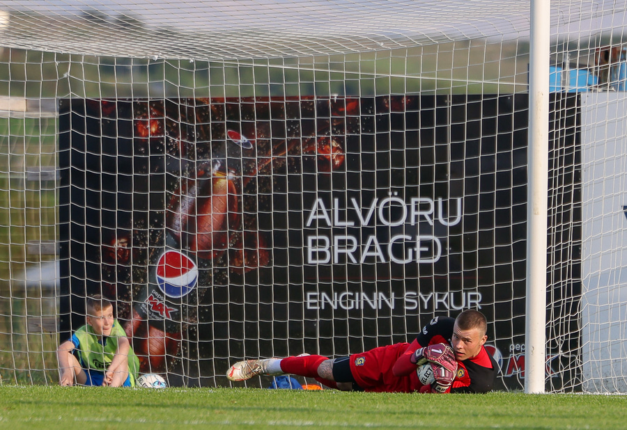 Aukaspyrnan léttilega varin hjá Sigurjóni