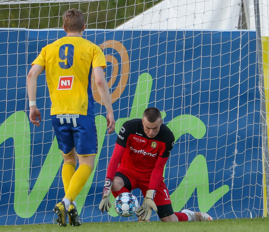 Andri Freyr sloppinn í gegn eftir langa sendingu fram og Marinó rífur hann niður, klaufalegt en hárrétt.