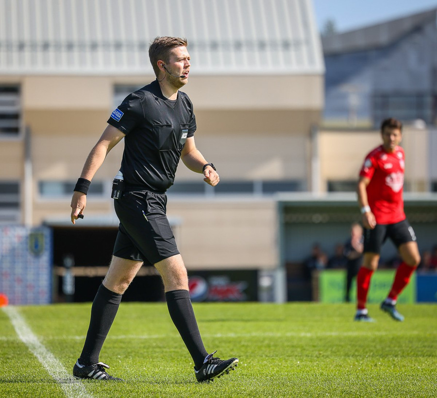 Guðgeir flautar til hálfleiks. Forystan verðskulduð og lærisveinar Magga úr Mosfellsbæ þurfa að sýna meira í síðari hálfleik ætli þeir sér eitthvað út úr þessum leik.