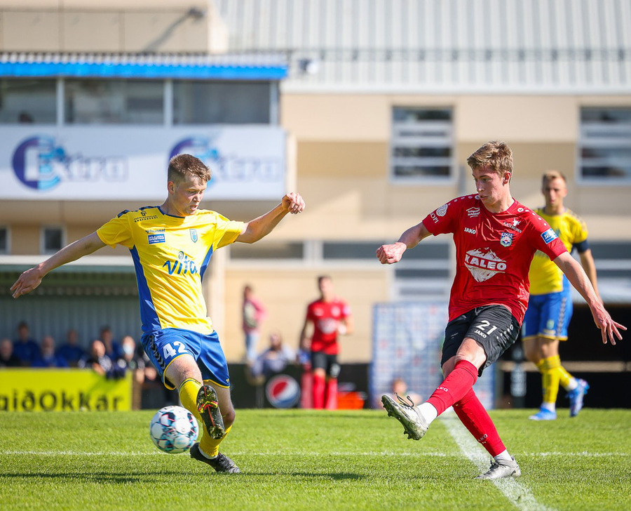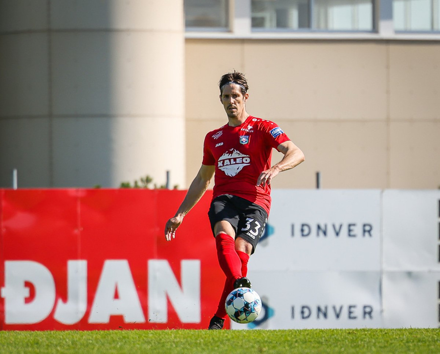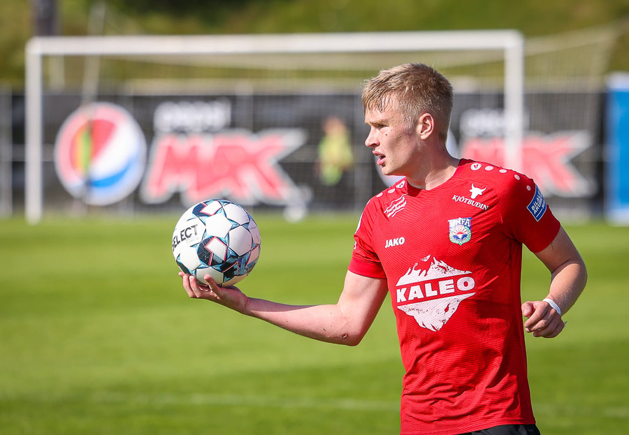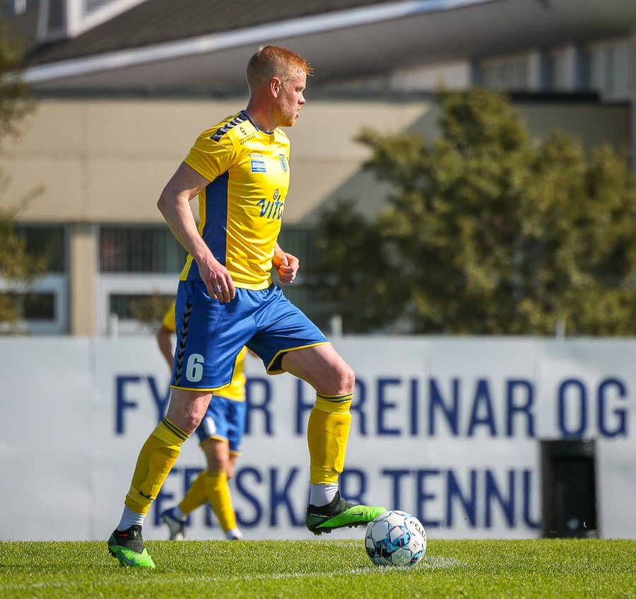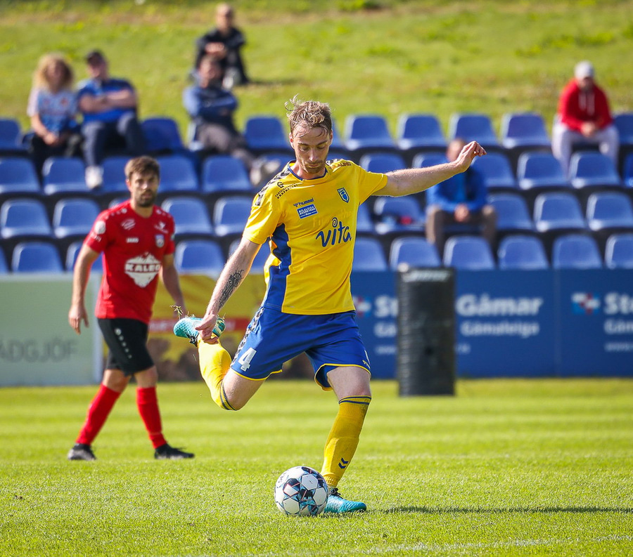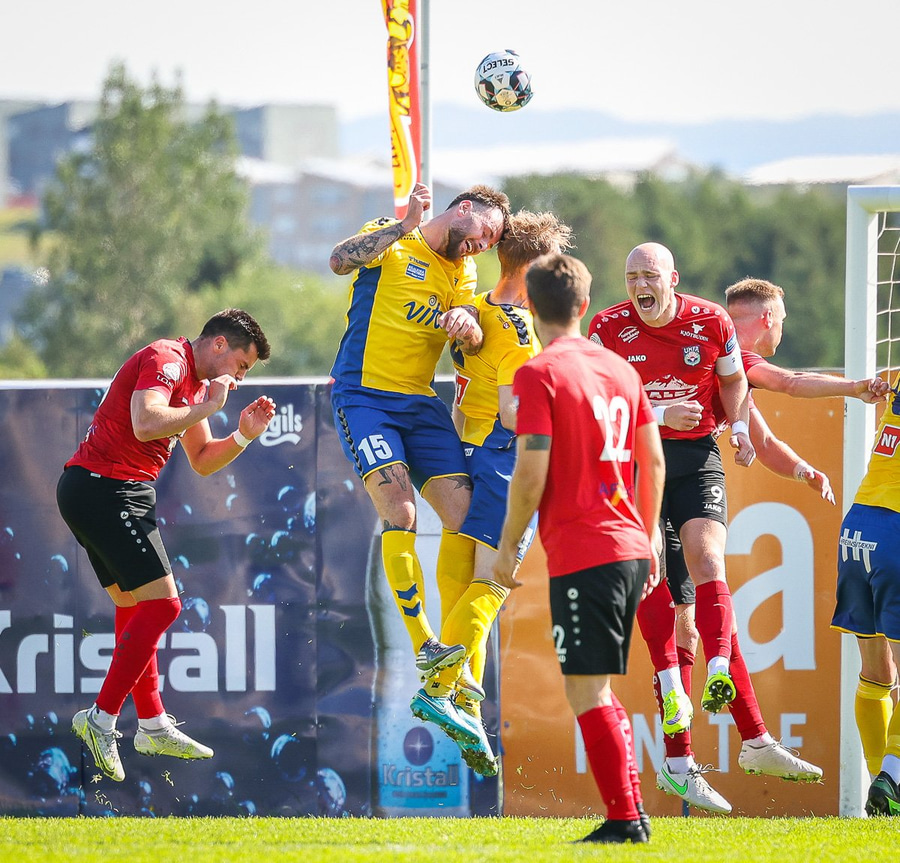 Pedro Vazquez með snögga aukaspyrnu sem Arnór Gauti nær að reka tærnar í á undan Sigurjóni. Boltinn yfir markið en besti séns gestanna til þessa.