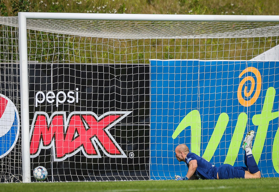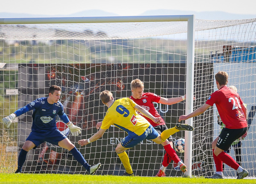 Skot langt utan af velli sem lekur í netið. Alls ekki það fast en vel út við stöng og Sindri Þór ræður ekki við það.