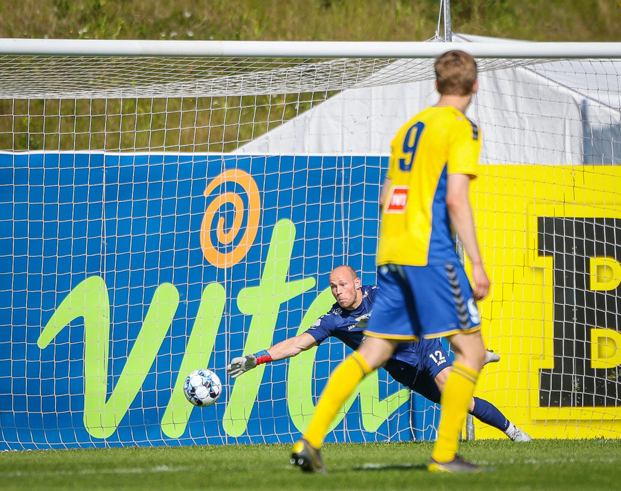 Gummi Kalli með hörkuskot sem Tanis ver vel.