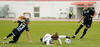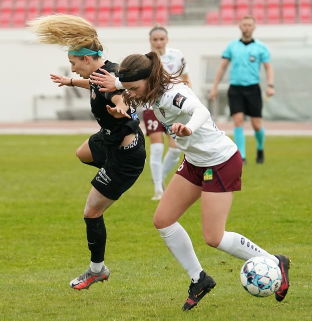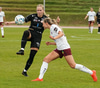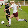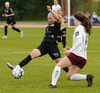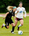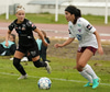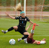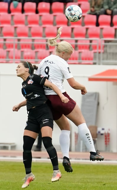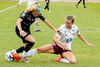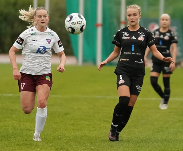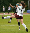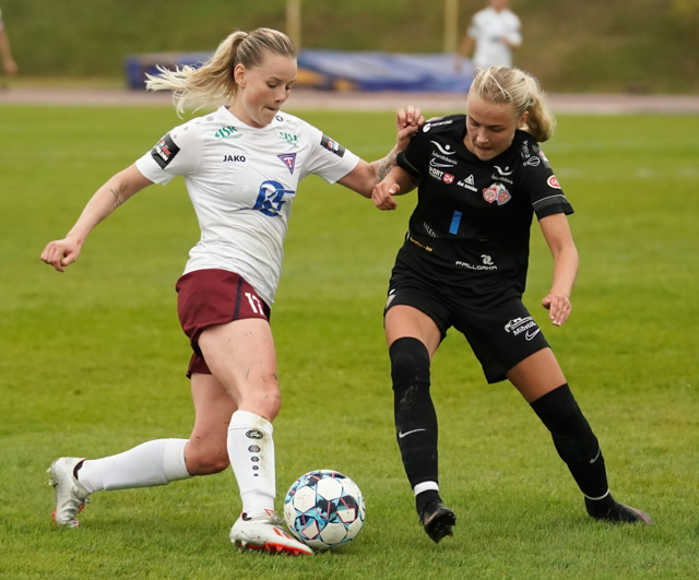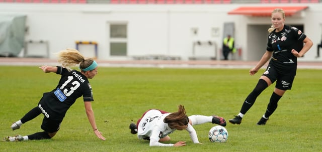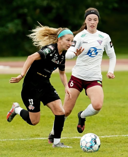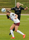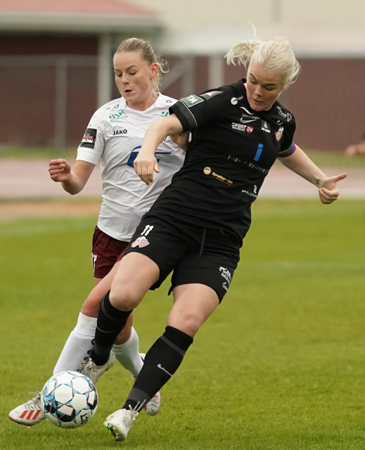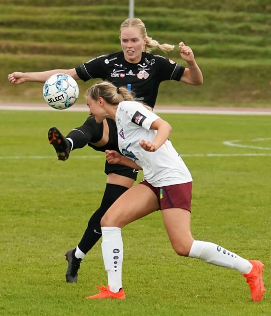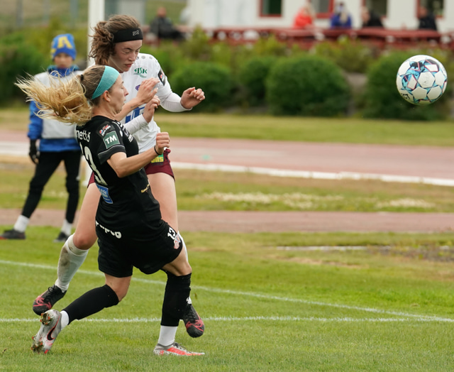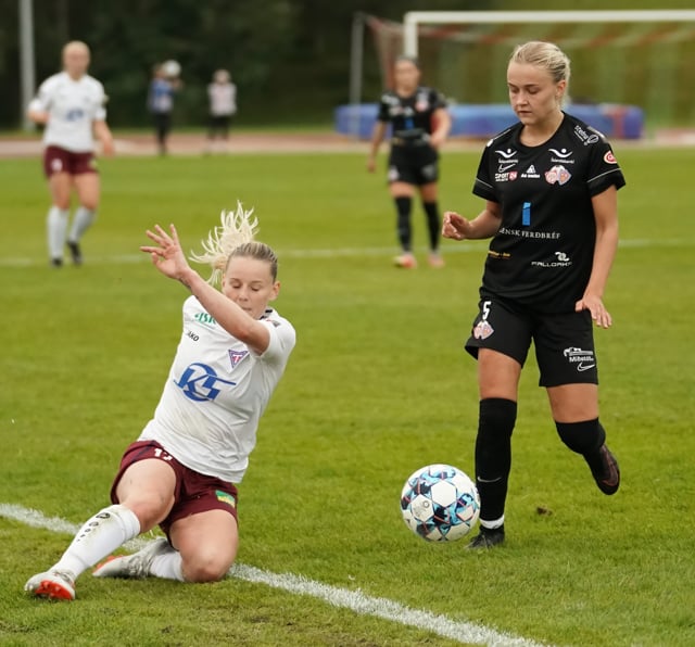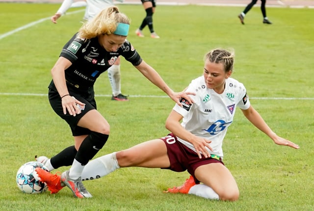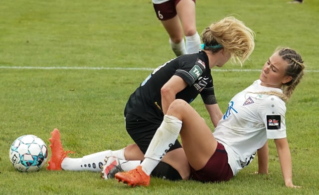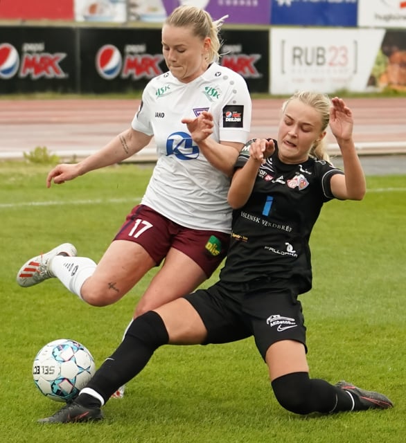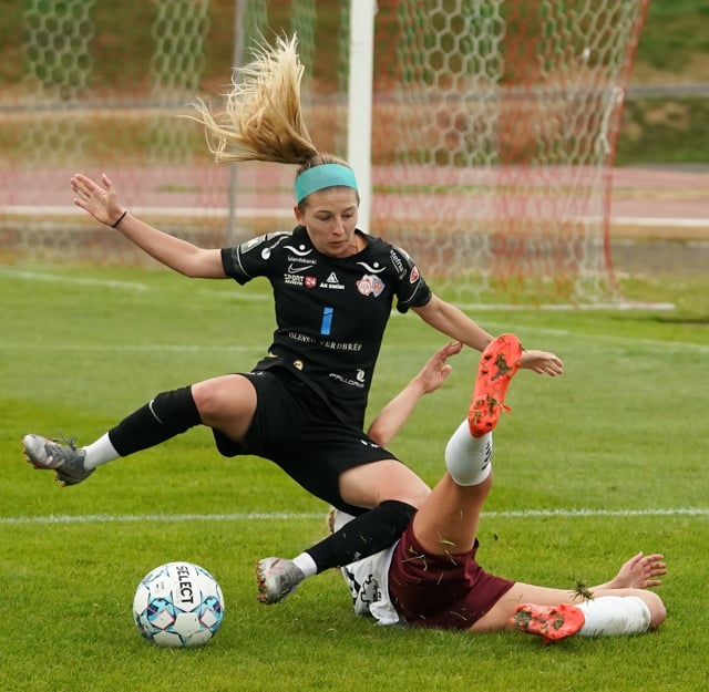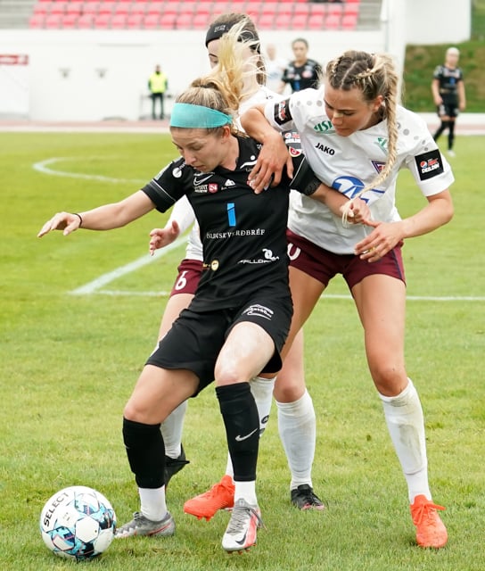 Colleen og Amber í baráttunni. Flott úthlaup hjá Amber, nær að tækla boltann frá rétt á undan Colleen í boltann.