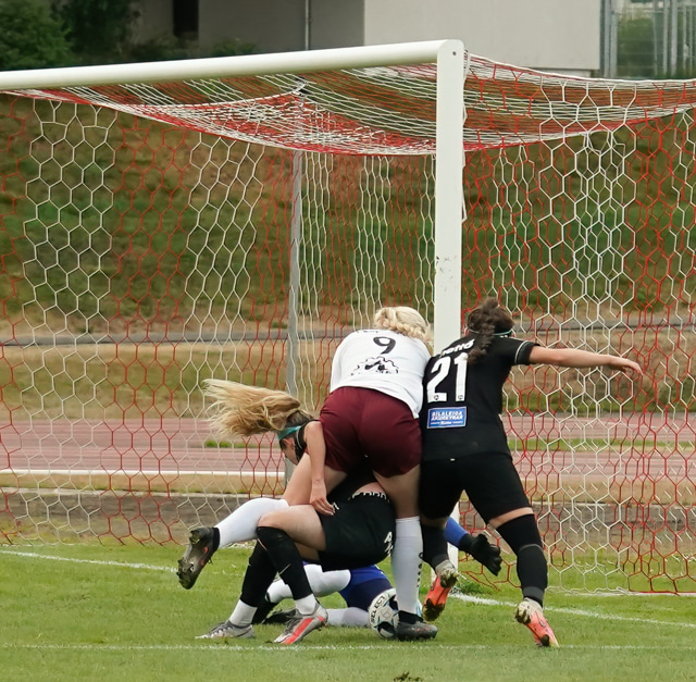 Amber með slaka hreinsun beint í fætur Margrétar sem á skotið en María Dögg kemst fyrir boltann.
