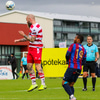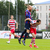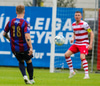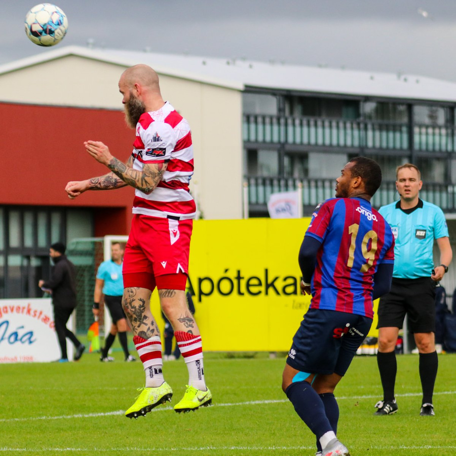 Ívar Örn með sendinguna á fjærstöngina og þar er Arnþór Ari. Guy í smá skógarhlaupi en skallinn frá Arnþóri fer í varnarmann.