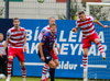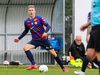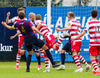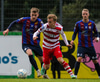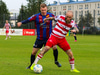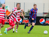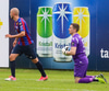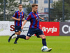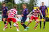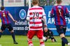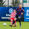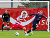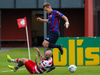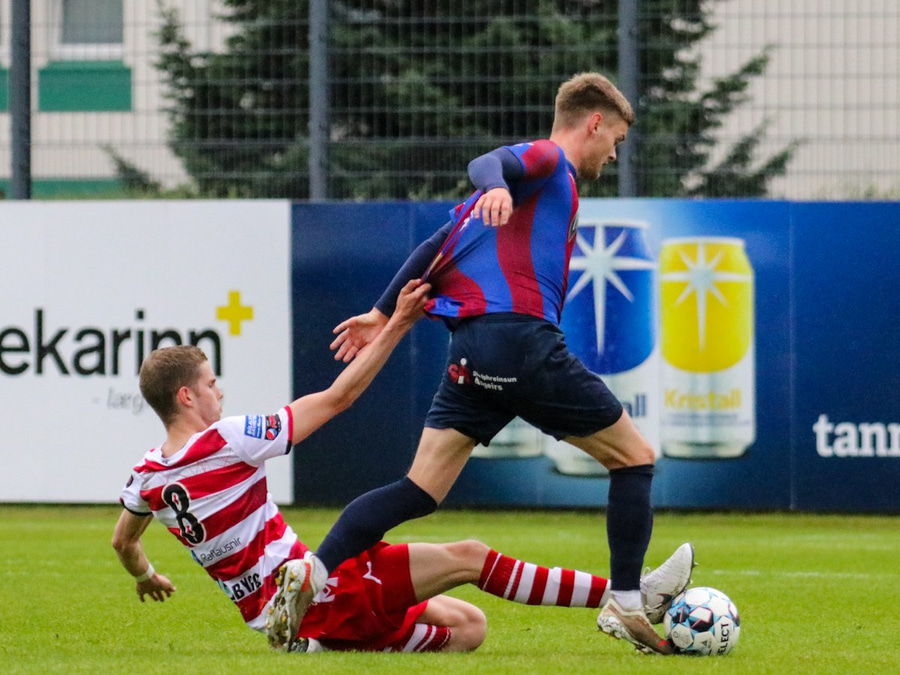 Hjalti fær boltann úti vinstra megin og kemur inn á völlinn og lætur vaða. Skotið er á markið en Martin Rauschenberg stendur fyrir og fær boltann í brjóstkassann.