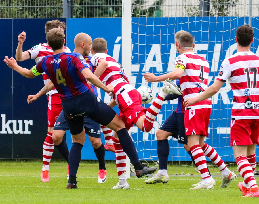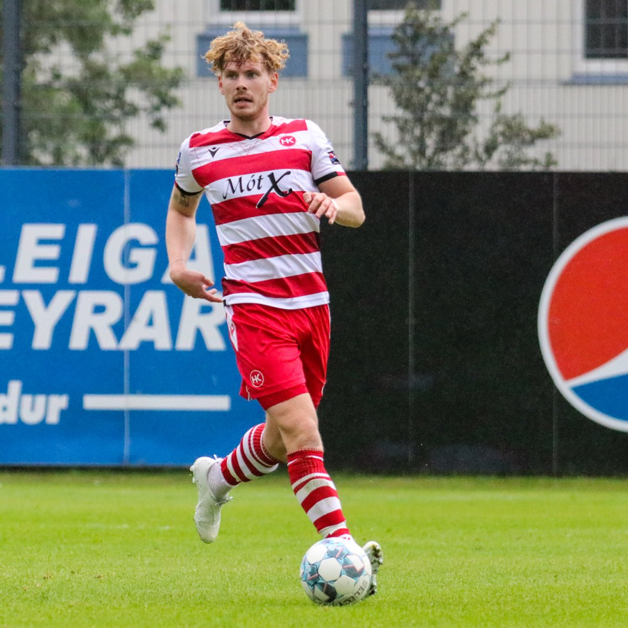 HK á horn, boltinn berst á Valgeir hinu megin við teiginn en Valgeir sendir fyrirgjöf beint afturfyrir.