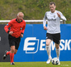 Morten Beck með stungusendingu á Jónatan en Ástbjörn sterkur og stöðvar þetta, öxl í öxl.