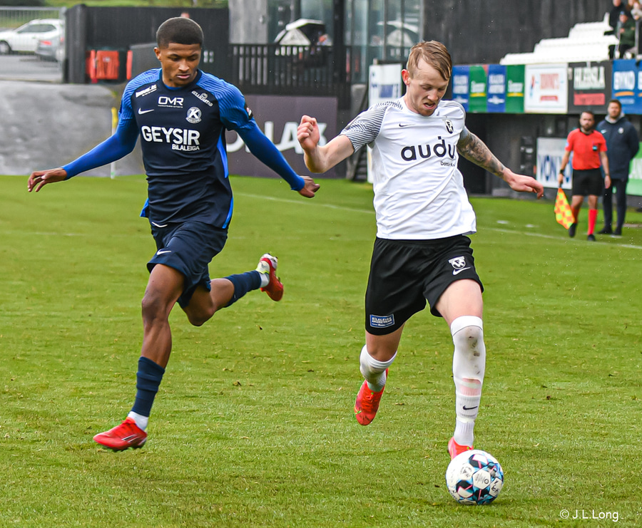 Jónatan Ingi gerir frábærlega, vinnur boltann af Kian og á svo frábæra sendingu á Morten Beck sem er í ljómandi góðu færi en hittir ekki á rammann.
