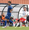 Fer aftan í Telmo, ekkert að hugsa um boltann. Alveg spurning um annan lit á spjaldinu..