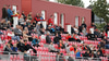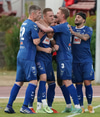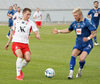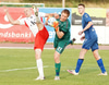 Liðin ganga hér út á völlinn. Heimamenn eru í sínum hvítu treyjum og rauðum stuttbuxum. Eyjamenn eru í bláu frá toppi til táar.