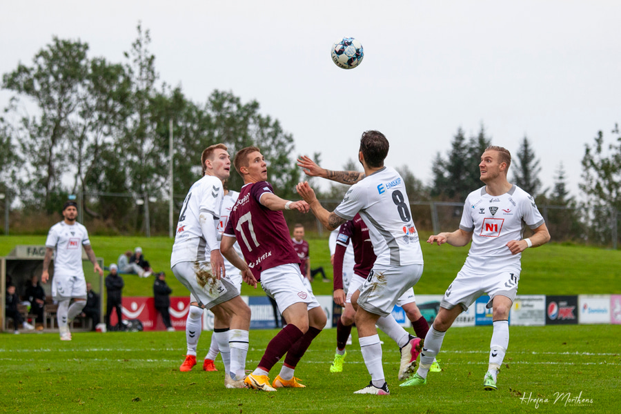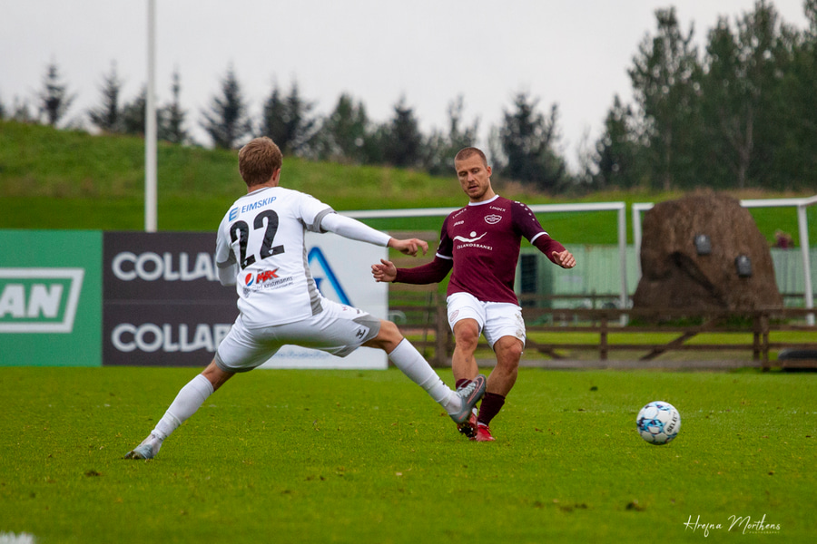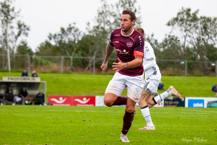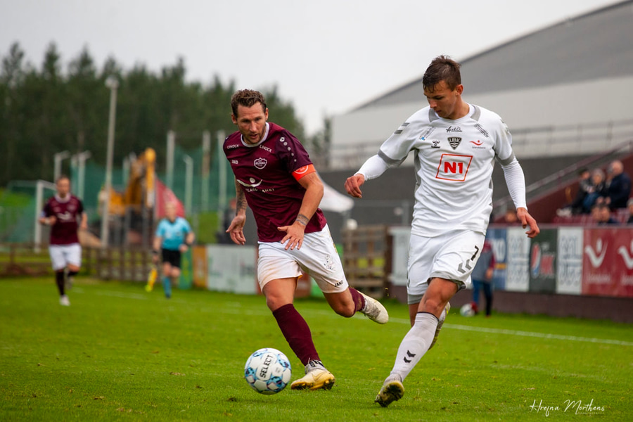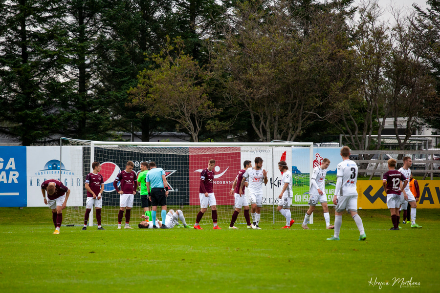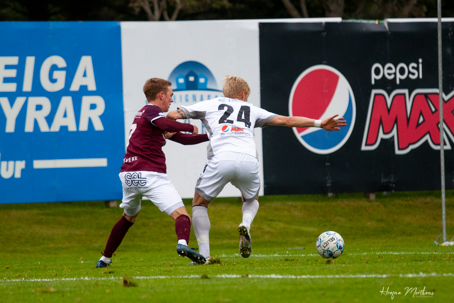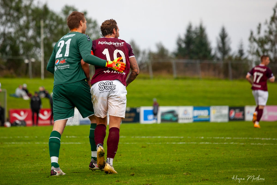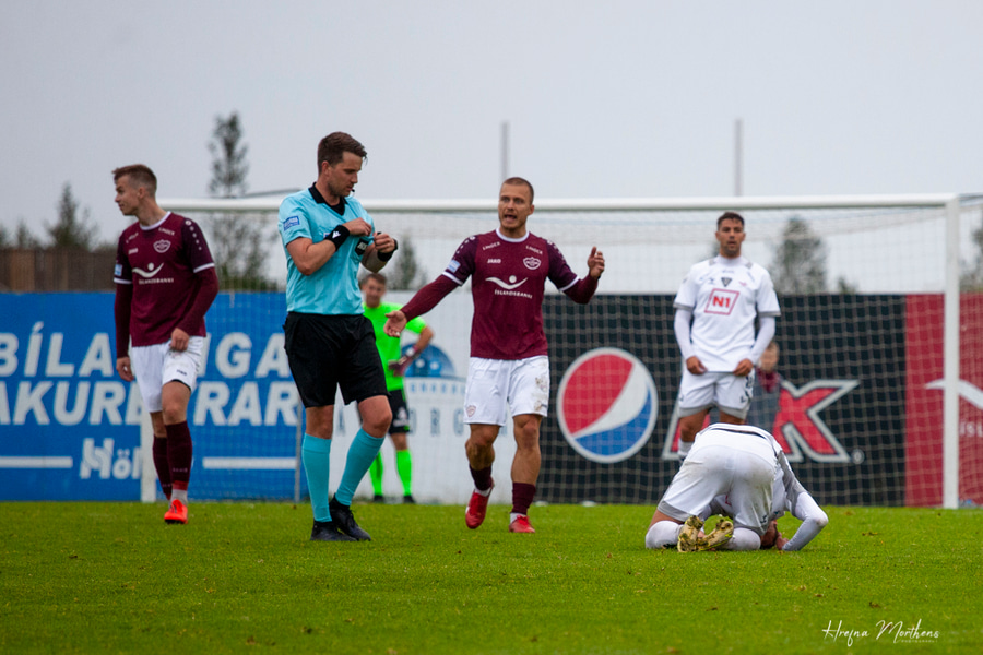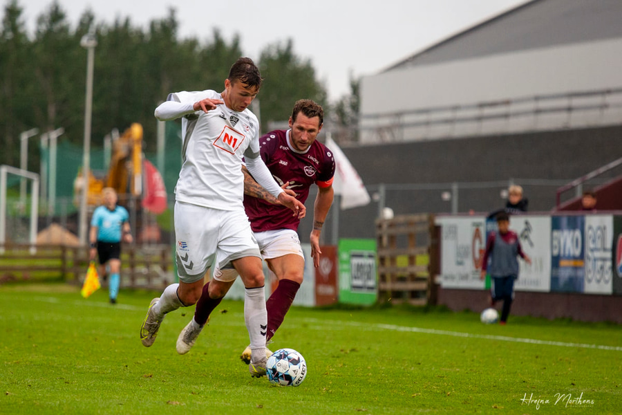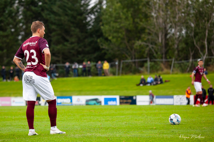 Þorsteinn með hættulega tæklingu og sleppur við spjald ekkert kemur úr spyrnunni.