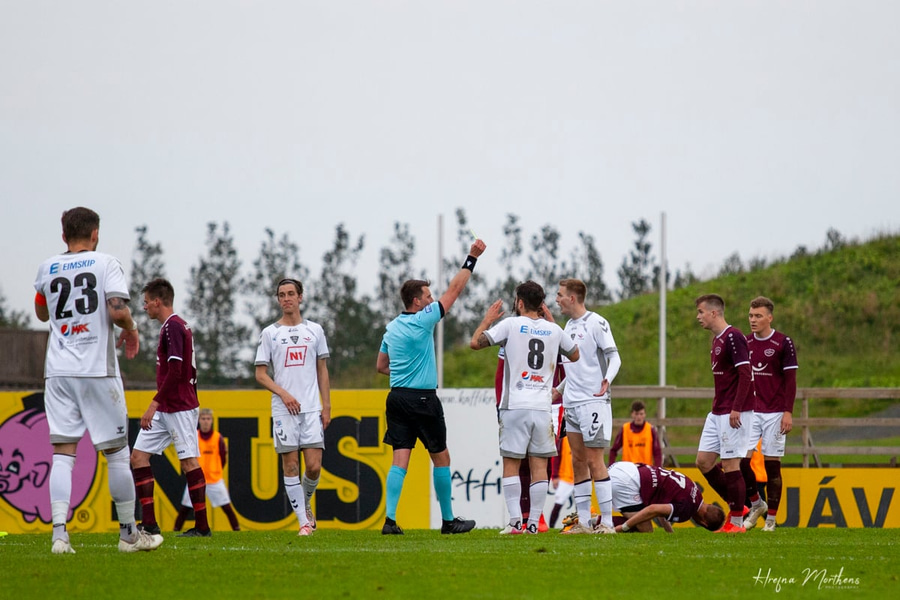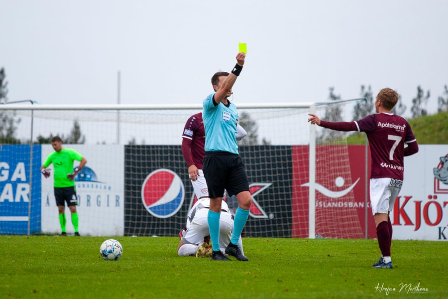 Sigurður með takkana beint á undann sér og fær verðskuldað gult.