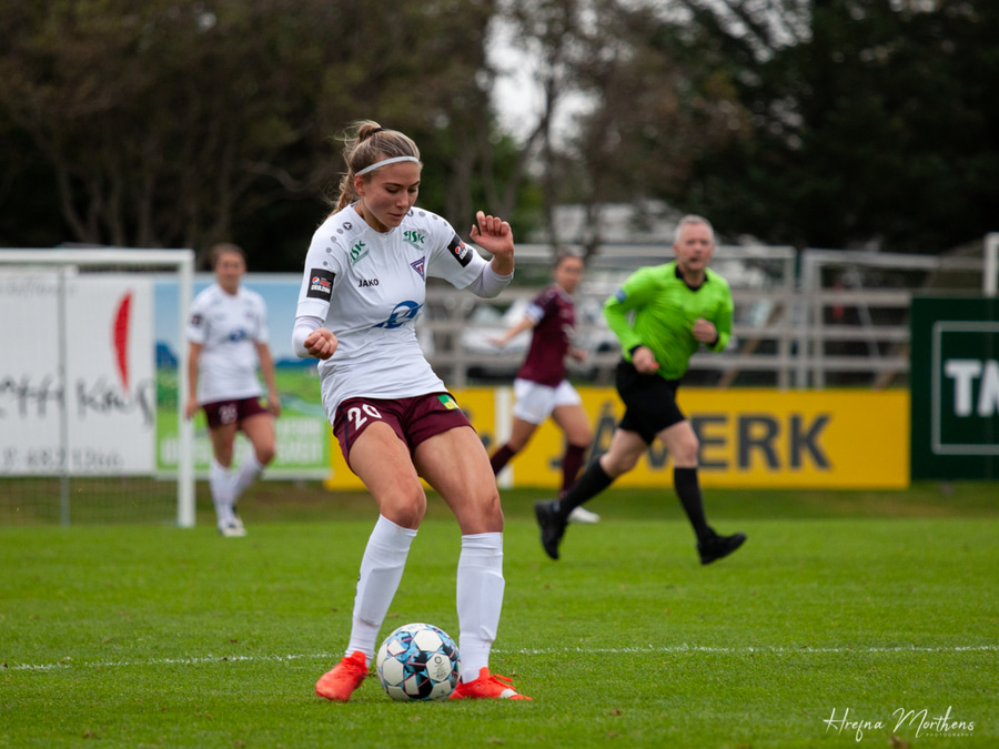 Susanna fær boltann á miðjunni og með góðan bolta á Evu í gegn en setur skotið rétt yfir.
