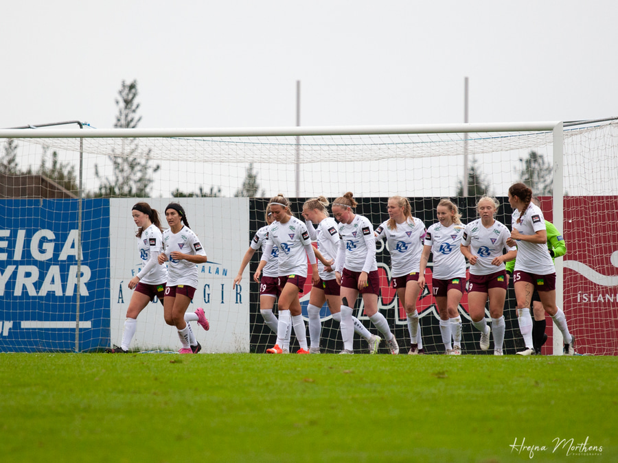 Murielle vinnur horn sem er tekið stutt á Laufey sem setur boltann inní og eftir mikið klafs þá setur Laura boltann yfir línuna.