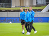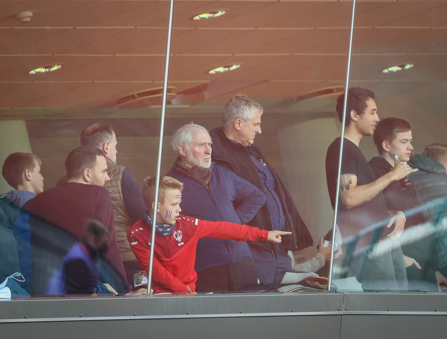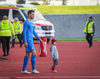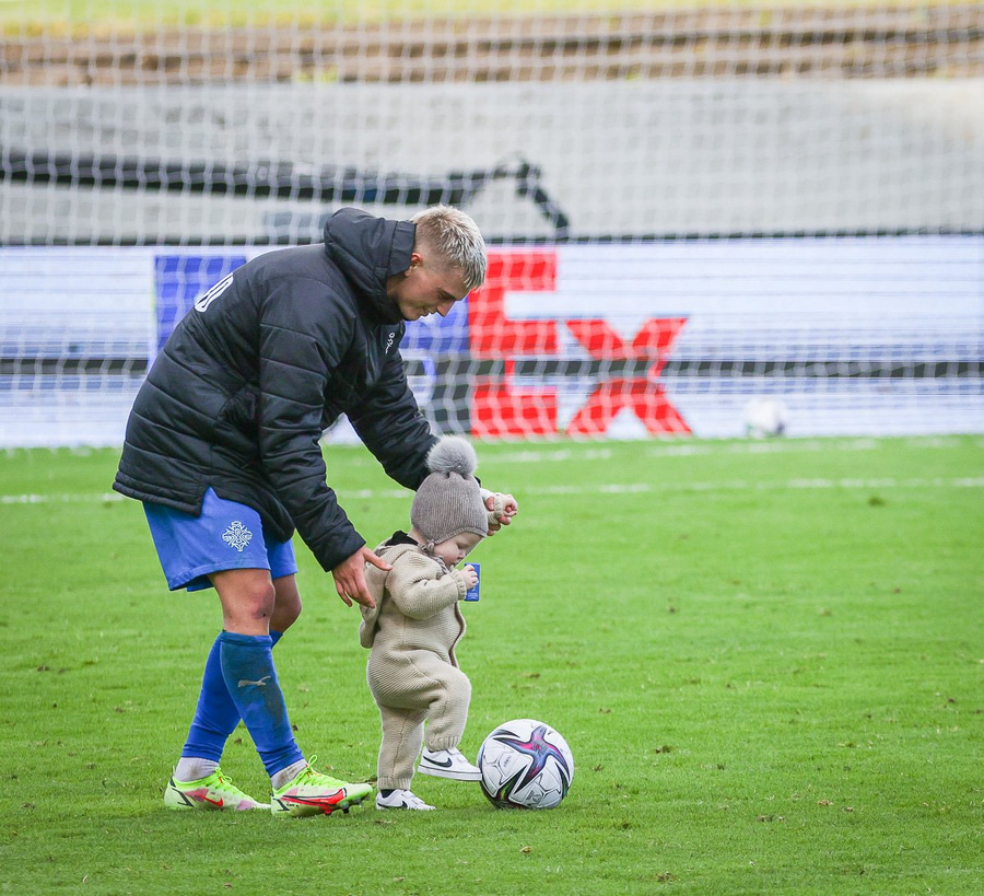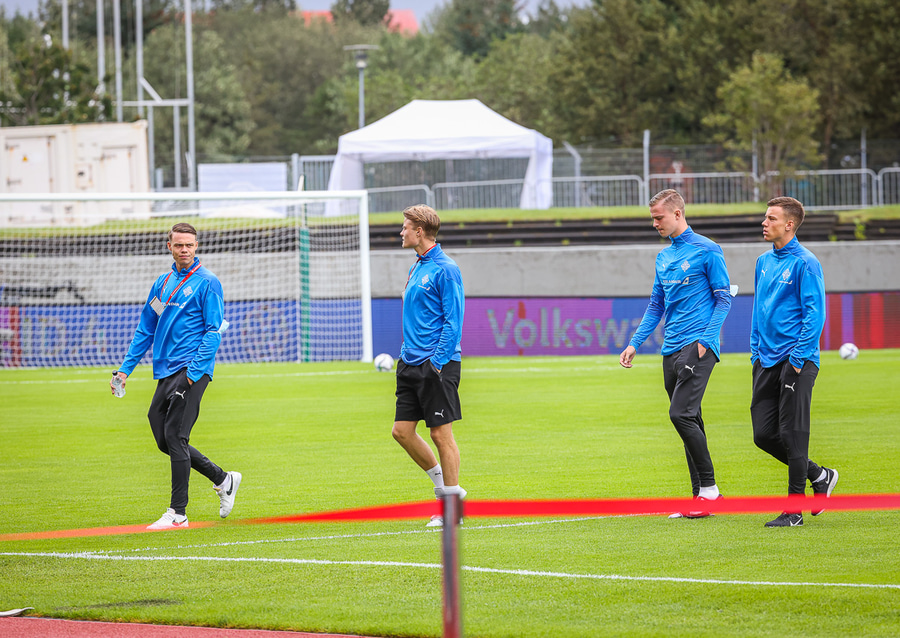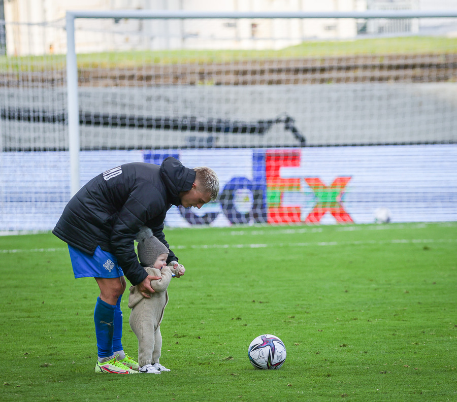 Leikmenn að skokka út í upphitun hér á Laugardalsvelli þegar rúmlega 40 mínútur eru í leik. Það hefur oftast verið meiri spenna fyrir landsleikjum en þessum í dag, það verður að segjast. Þrátt fyrir að aðeins 2.200 komist að vegna sóttvarnareglna hér á landi er enn hægt að kaupa miða á leikinn hjá krökkunum á Tix.