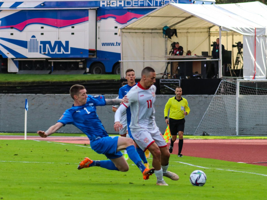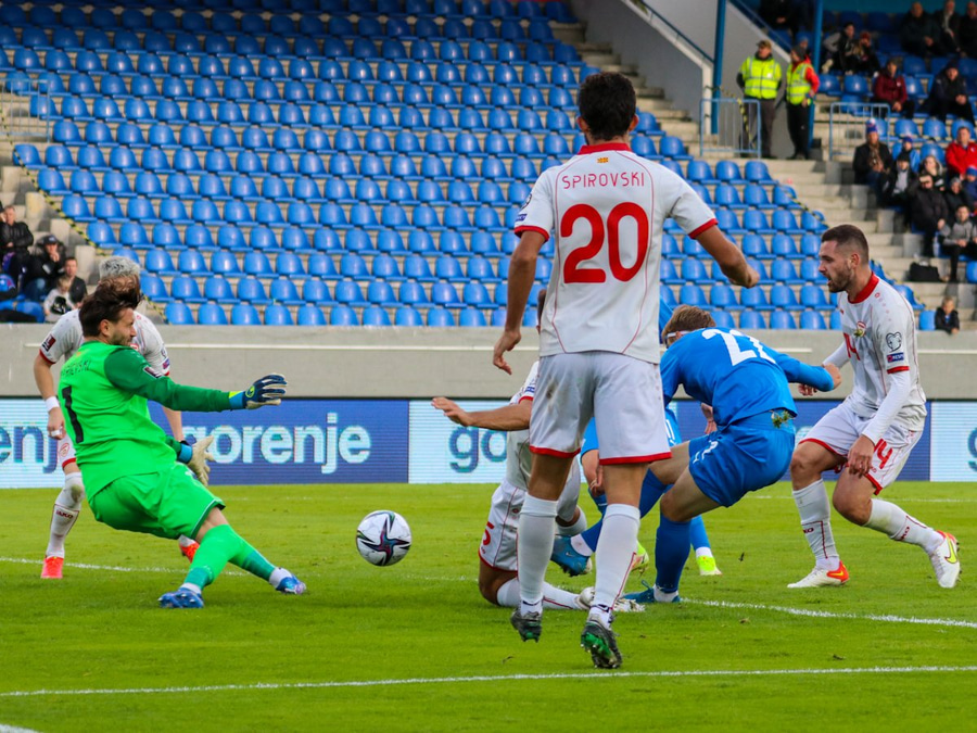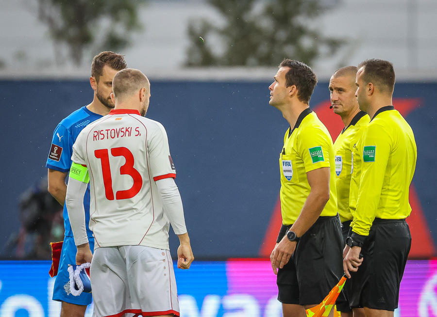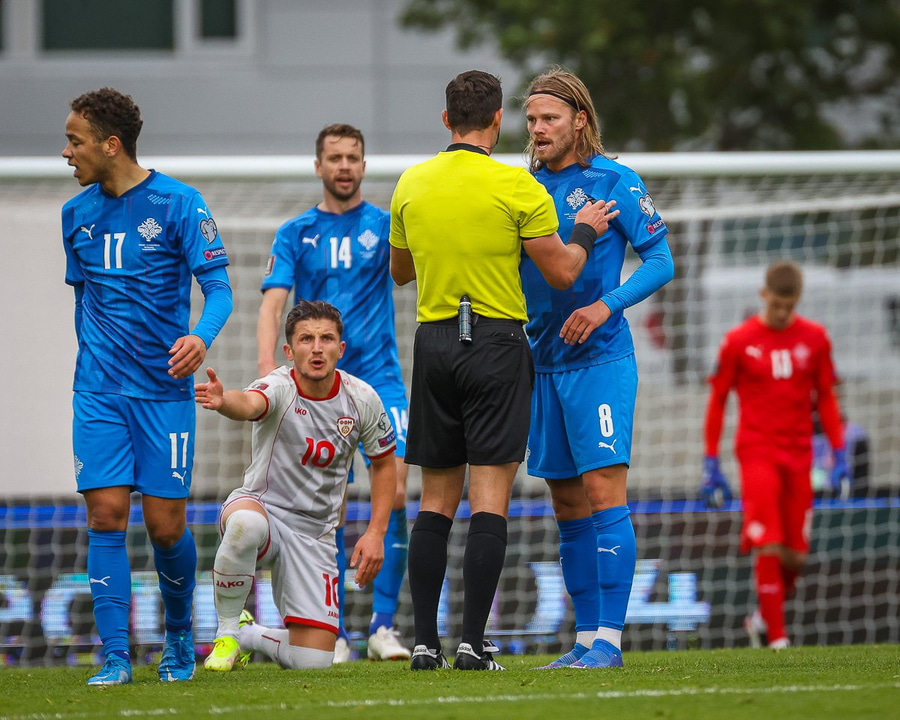 Leikmaður Norður-Makedóníu með galna tæklingu og óskiljanlegt að hann hafi ekki fengið gult. Sleppur með tiltal.