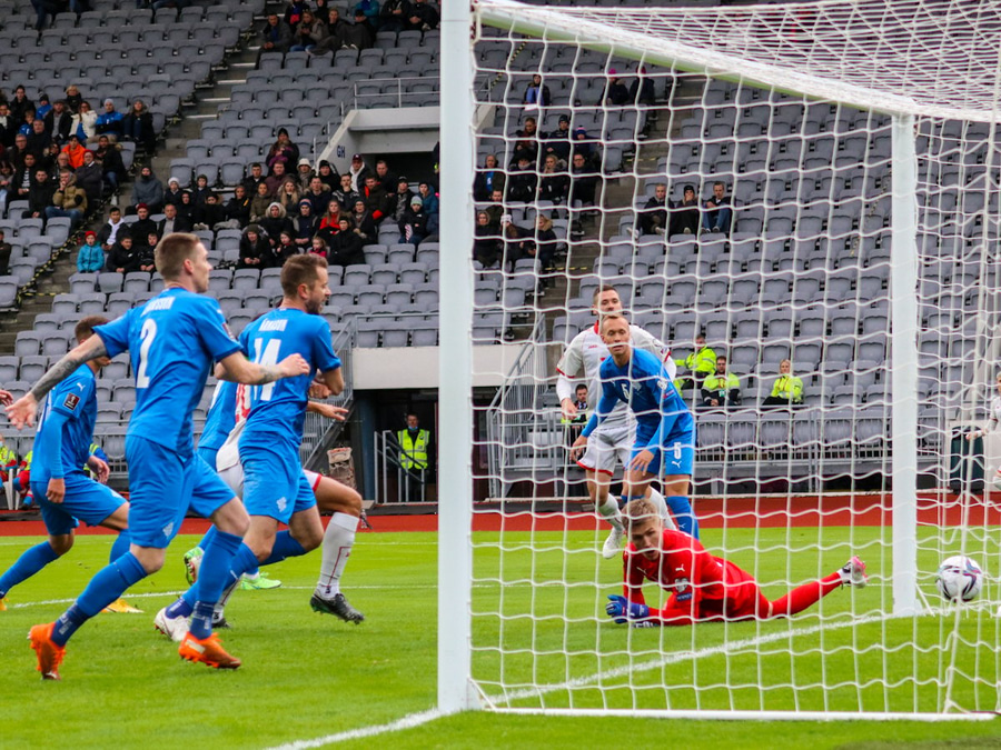 Enis Bardi með skot sem skýst af leikmanni Íslands og í hornspyrnu. Fyrsta hornið sem gestirnir fá.