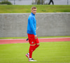 Gestirnir fá aukaspyrnu á miðjum vallarhelmingi Íslands. Enis Bardi með bjartsýnina að vopni og tekur skotið. Hátt yfir.