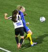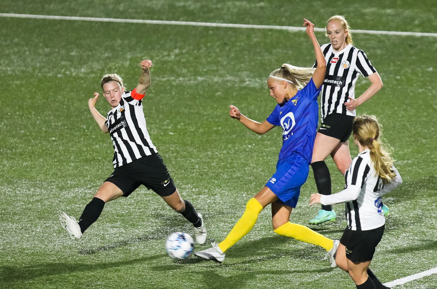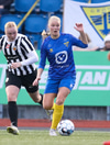 Signý fer upp fram hjá Kristínu og á langan sprett upp völlinn ætlar að stinga boltanum yfir á Elfu en Ingibjörg nær til boltans á undan.