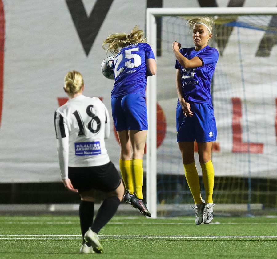 Aideen kemur með fyrigjöf af hægri kantinum á fjærstöngina en Lilja Lív er á undan Margréti Eddu í boltann.
