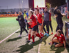 Ragna Guðrún með spyrnuna, svífur yfir alla í teignum og rennur í sandinn.