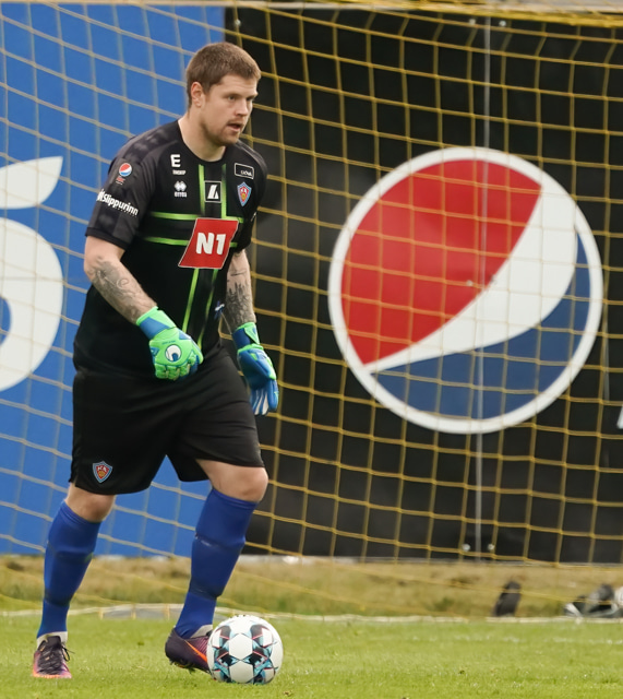 Elfar Árni gerir, að mér fannst, heiðarlega tilraun til þess að vinna háan bolta gegn Aroni en markmaðurinn hirðir boltann. Í kjölfarið eiga sér stað einhver samskipti þar sem að báðir liggja eftir. Ég skil ekkert hvað er í gangi.