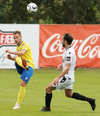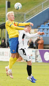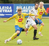 Bæði lið þurfa nauðsynlega á þremur stigum að halda. Hér eltir Hallgrímur Mar Steingrímsson kantmanninn Valdimar Þór Ingimundarson, sem nú spilar með Stromsgödset í Noregi, í leik liðanna í fyrra.