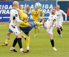 Qvist er stutt frá því að komast í boltann en Fylkismenn hreinsa burt. KA heldur boltanum.
