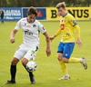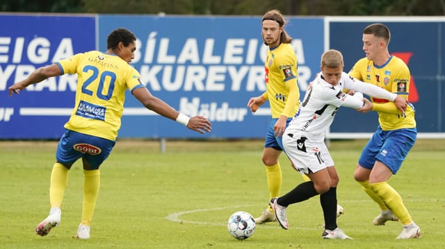 Guðmundur Steinn kemst í þröngt færi en Mikkel Qvist mætir og blokkar skotið í horn.
