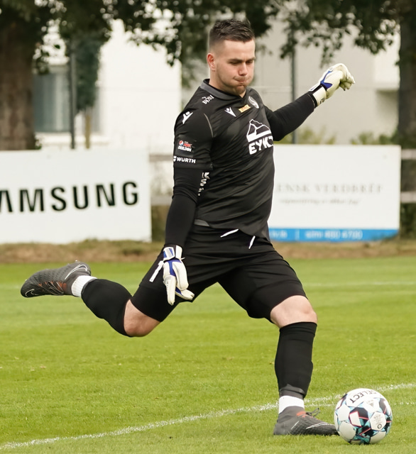 Hallgrímur smellir boltanum beint á hausinn á Mikkel Qvist en Daninn stýrir honum á mitt markið af mjög stuttu færi.