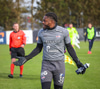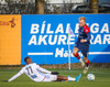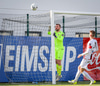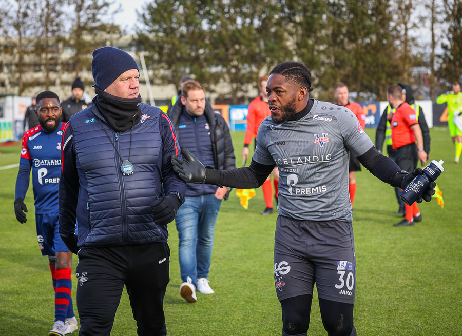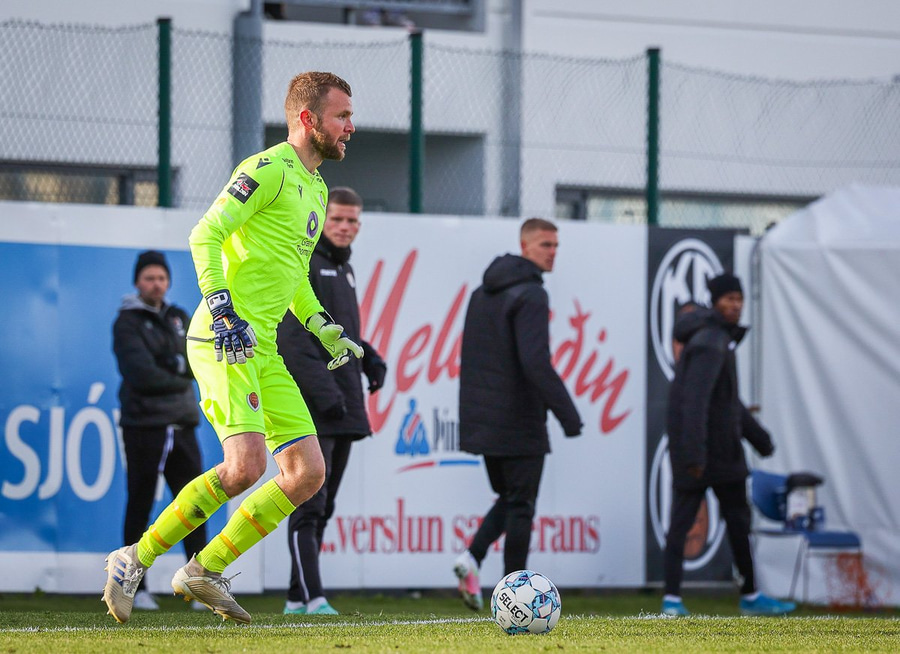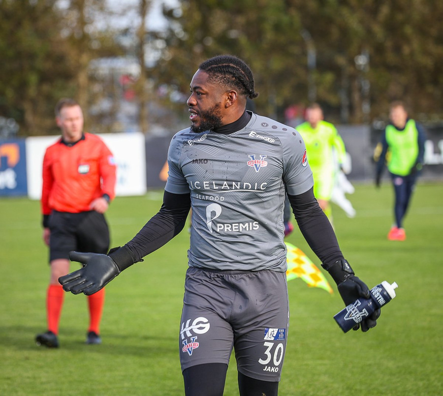 Viktor tekur spyrnuna en boltinn ratar beint á Muhammad sem handsamar knöttinn auðveldlega.