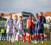 Það er harka í leiknum á fyrstu mínútunum, nú þegar tvisvar búið að sparka bolatnum útaf til að athuga hvort menn séu í lagi.