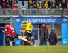 Nú liggja menn niðri!! Ísak og Ingvar lenda í samstuði og hlaupa menn inn á völlinn að gefa þeim aðhlynningu!