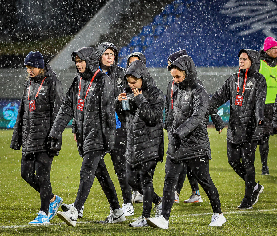 Aðstæður: Rigning og vindur, völlurinn er blautur og laus í sér