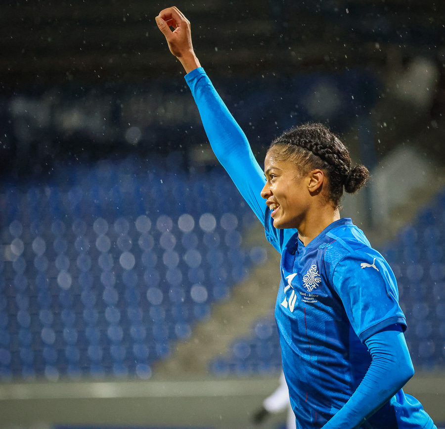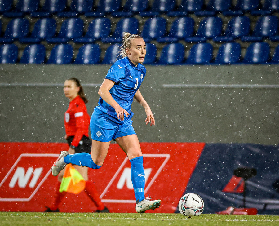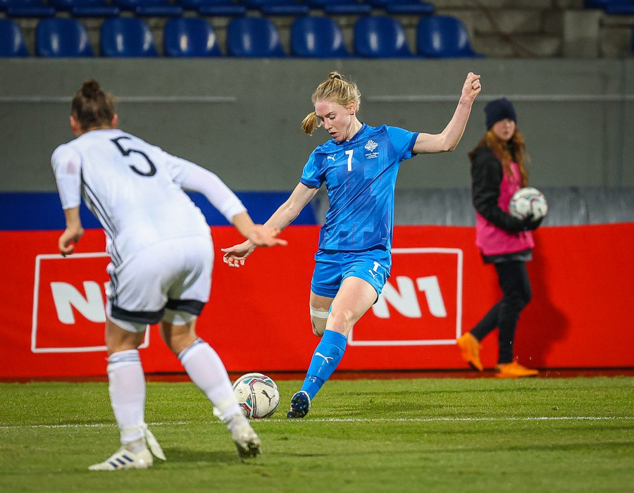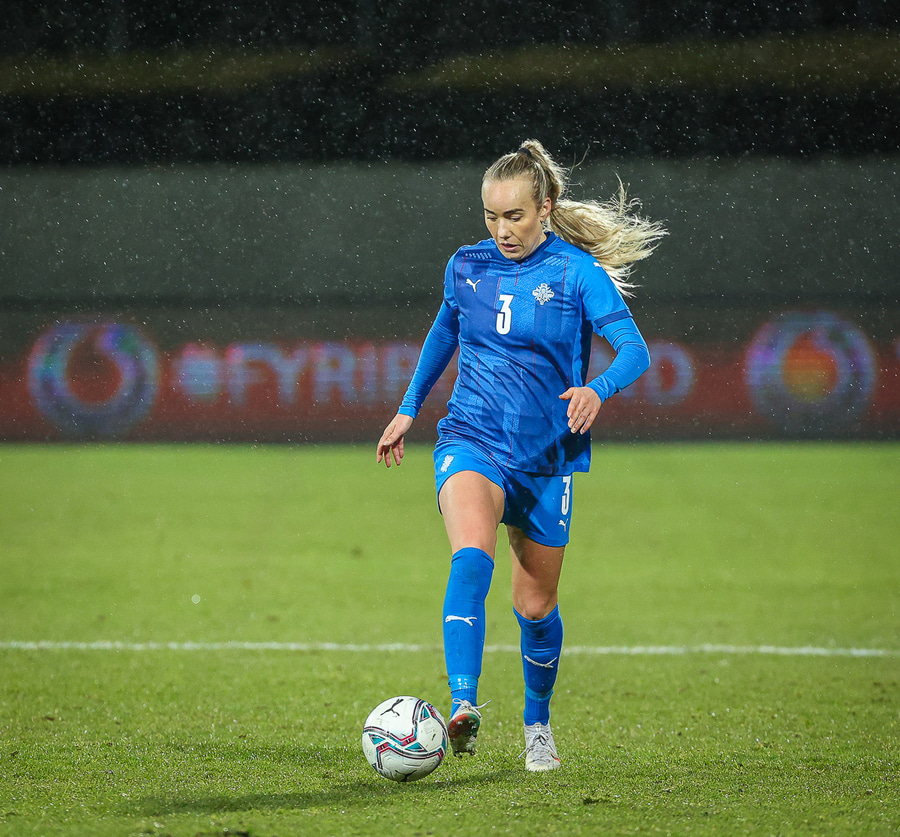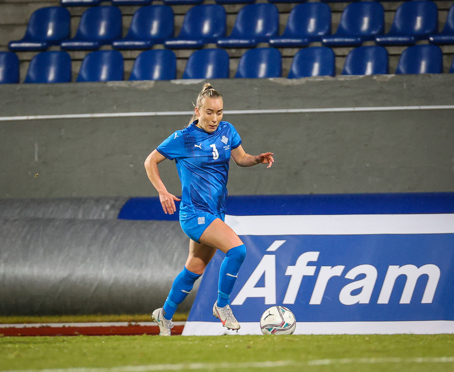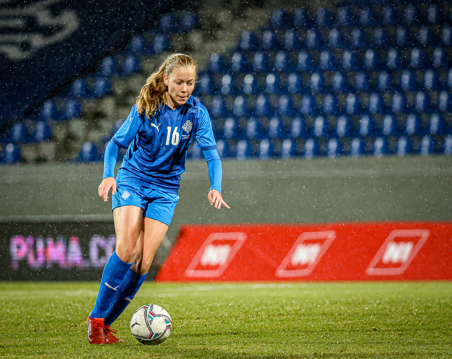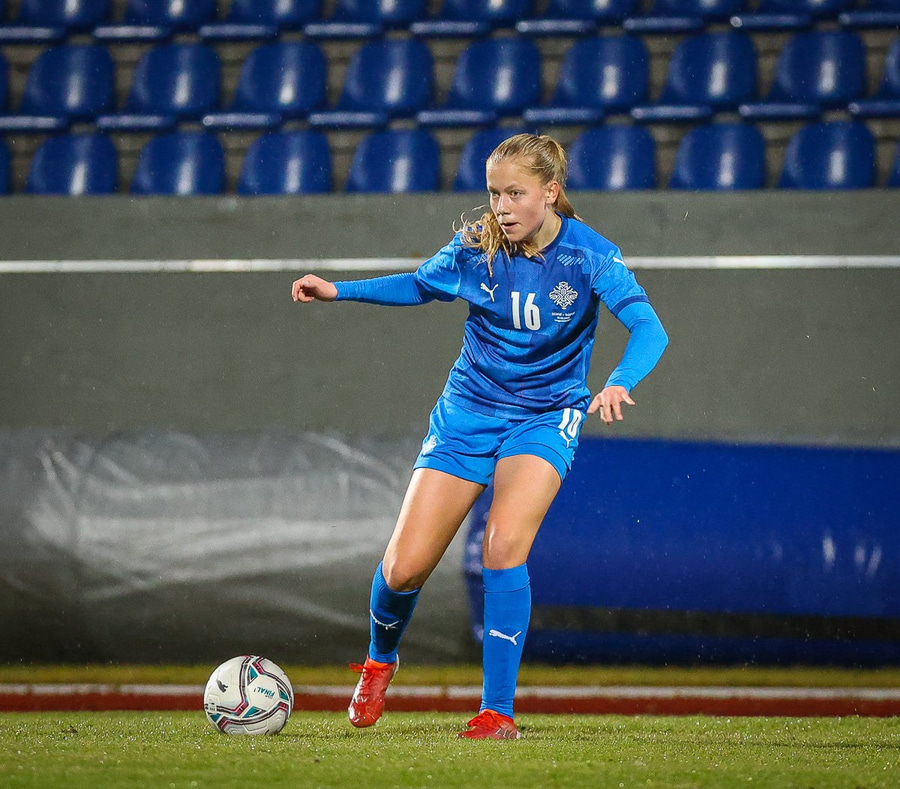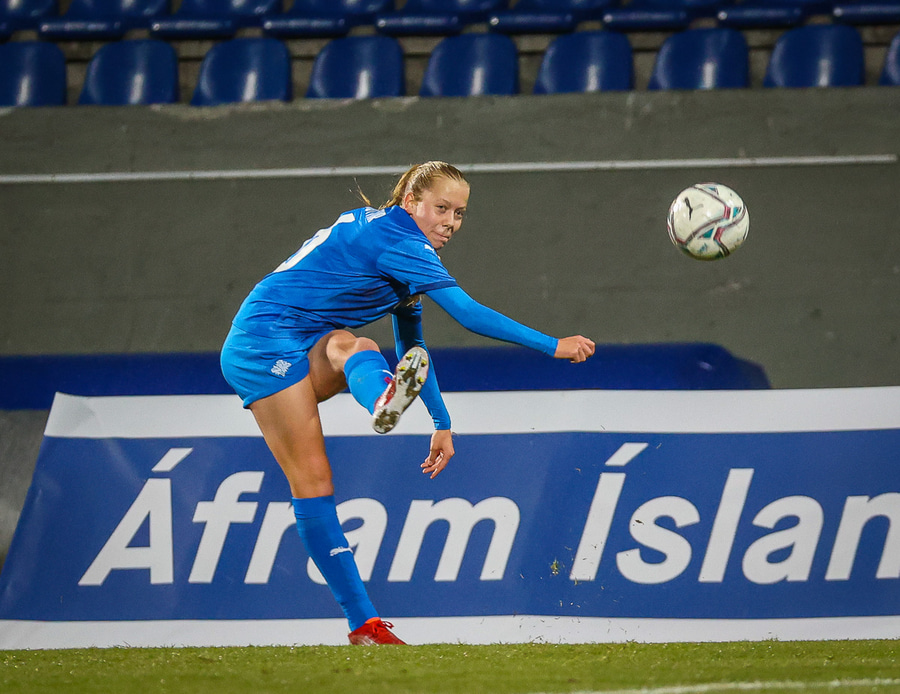 Hin 17 ára gamla Amanda Andradóttir spilar sinn annan A-landsleik. Hún er að byrja í fyrsta sinn fyrir Ísland.
