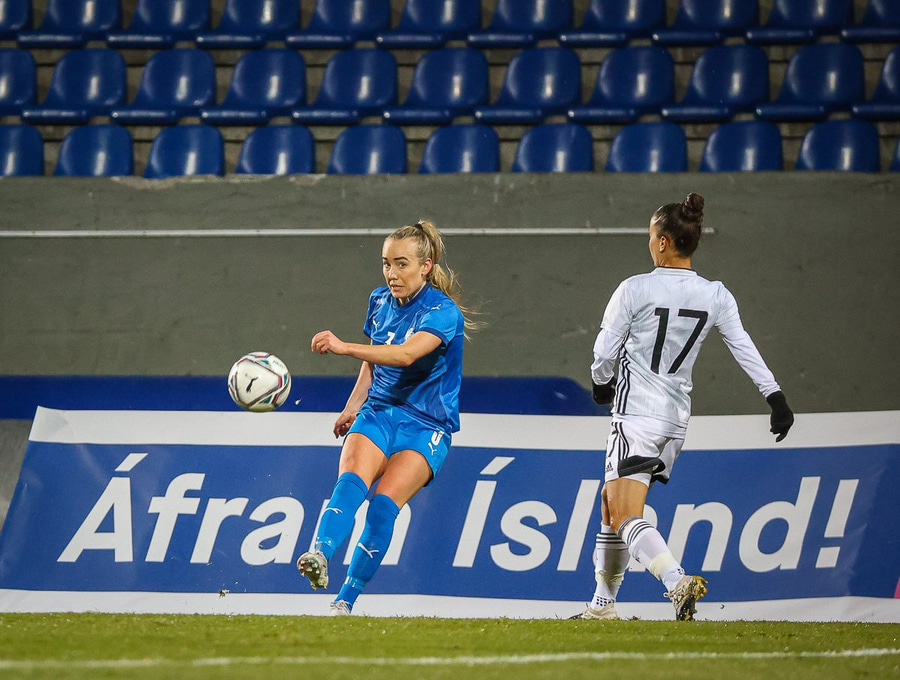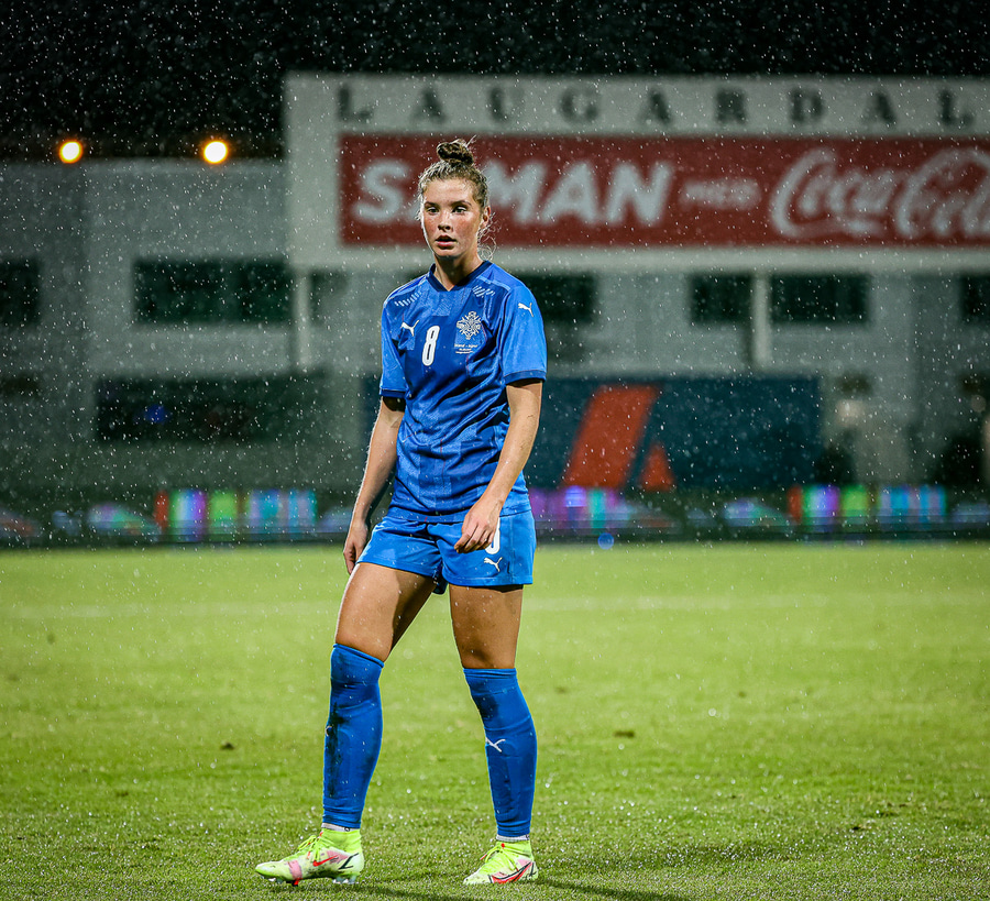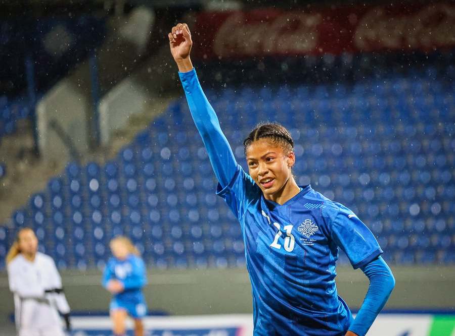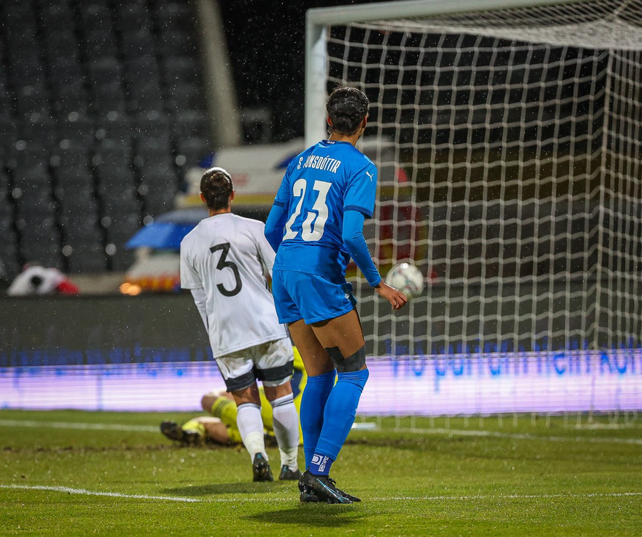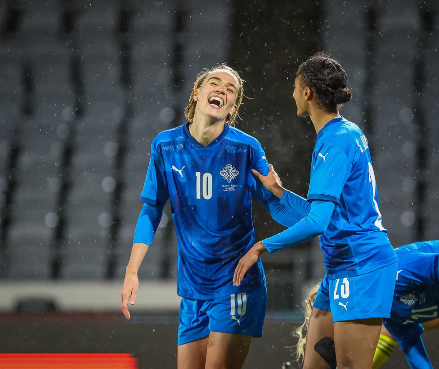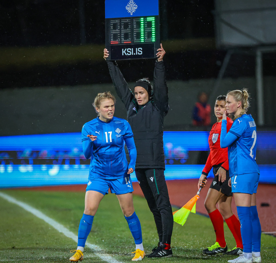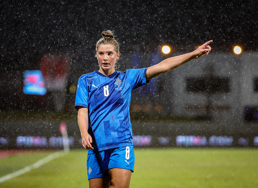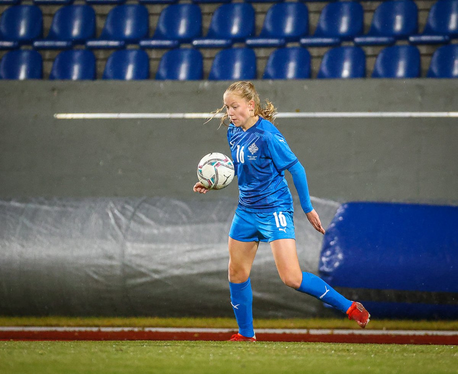 Hin 17 ára gamla Amanda Andradóttir spilar sinn annan A-landsleik. Hún er að byrja í fyrsta sinn fyrir Ísland.
