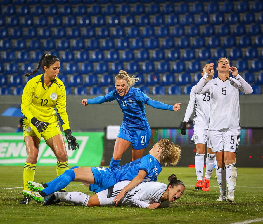 Amanda með frábæran undirbúning, snýr af sér varnarmann Kýpur og leggur hann út í hlaupaleiðina fyrir Elísu sem setur hann fyrir og Dagný stangar hann í markið.