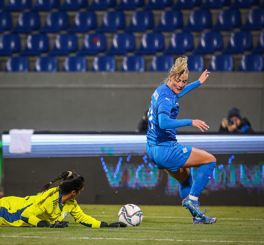 Alexandra leggur boltann út til hægri á Sveindísi sem spólar fram hjá bakverði Kýpursog smyr svo boltann upp í þaknetið, geggjuð afgreiðsla.