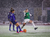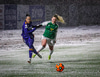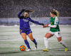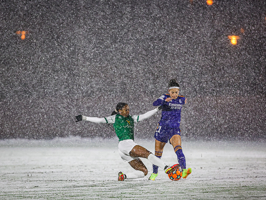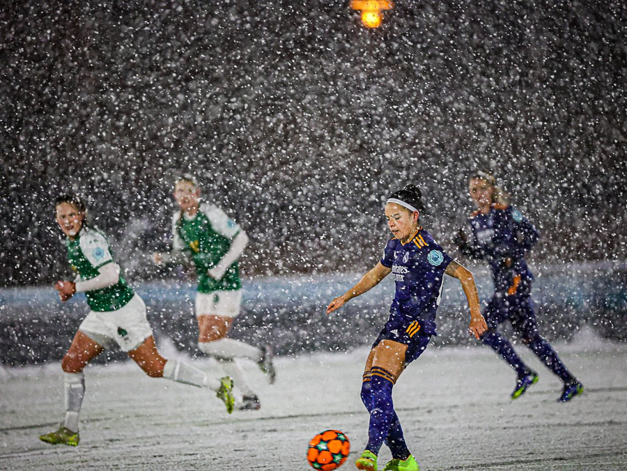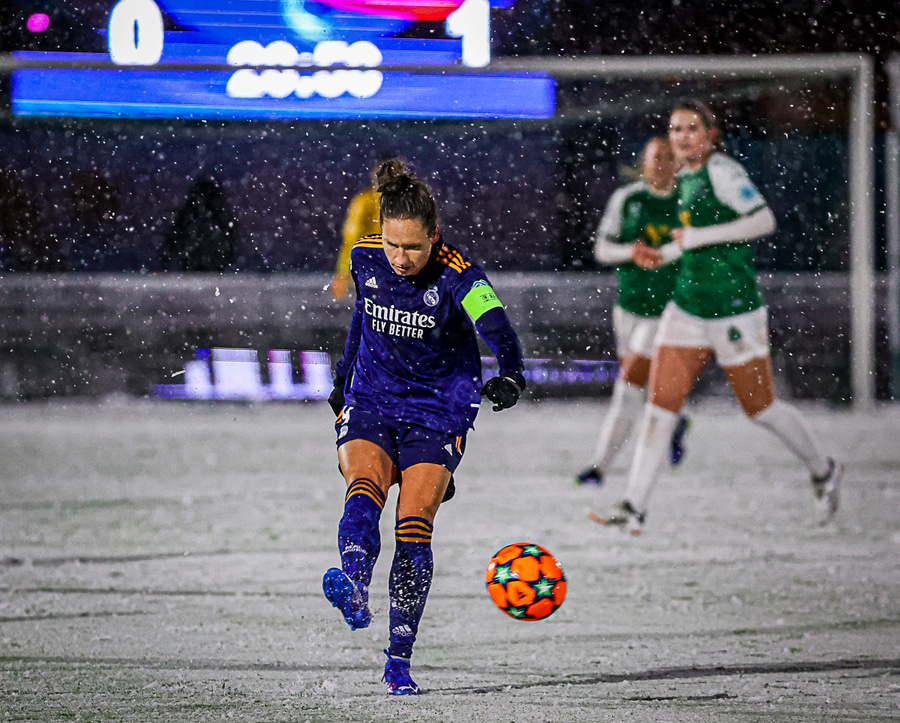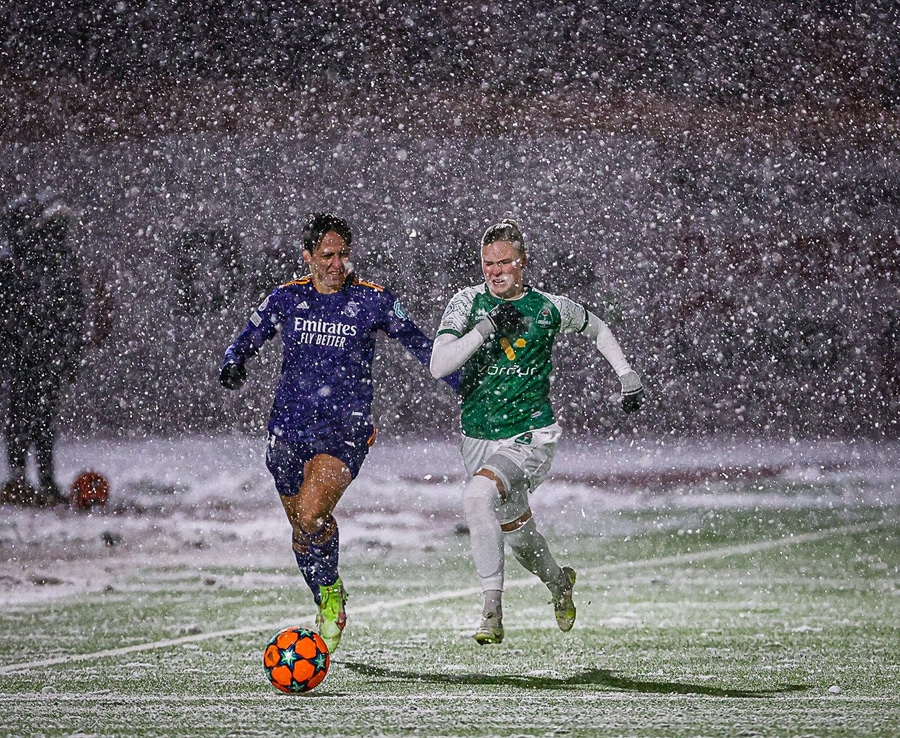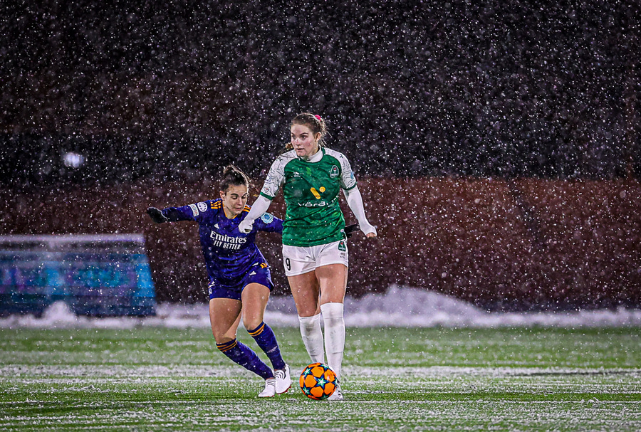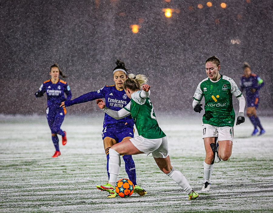 Vel unninn bolti hjá Blikum. Taylor fer í átt að teig Real, reynir skot en Rocio Galvez kemst fyrir.