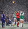 Zornoza með aukaspyrnu sem Peter skallar og boltinn spýtist á grasinu. Telma gerir vel að verja í horn.