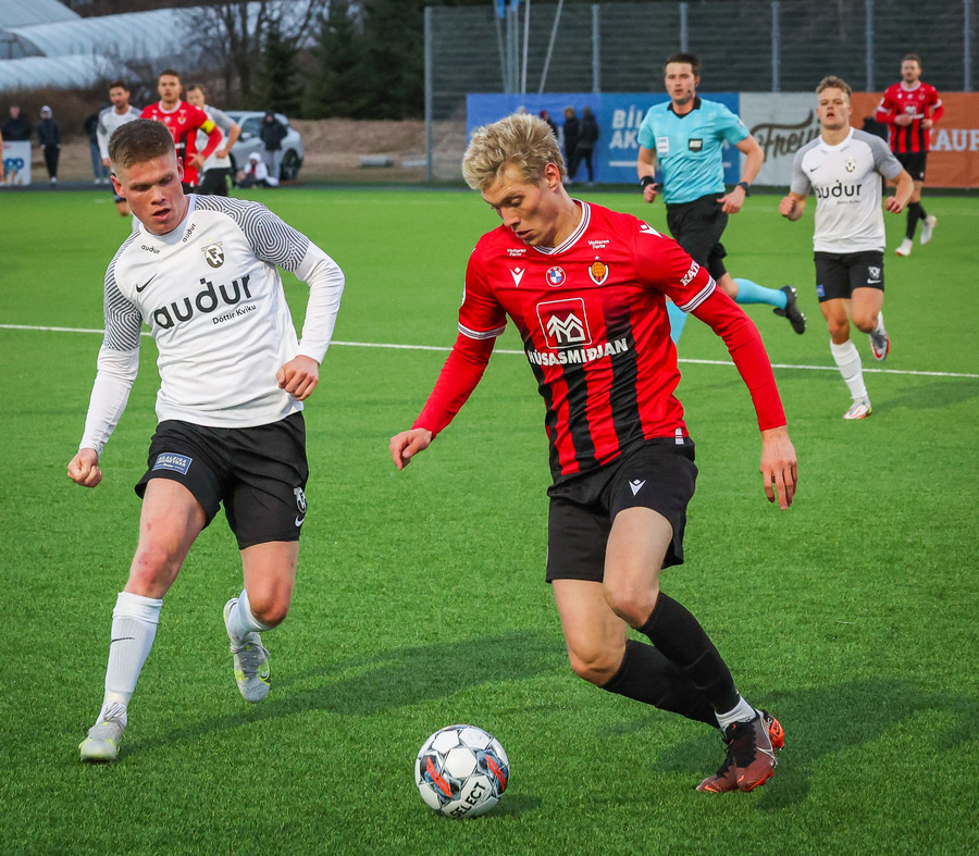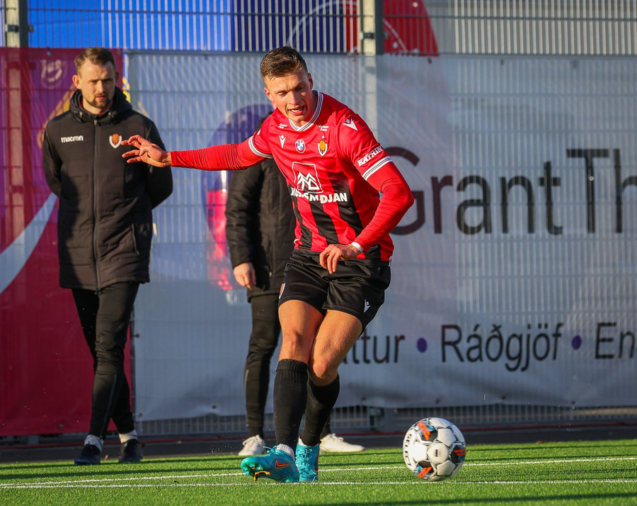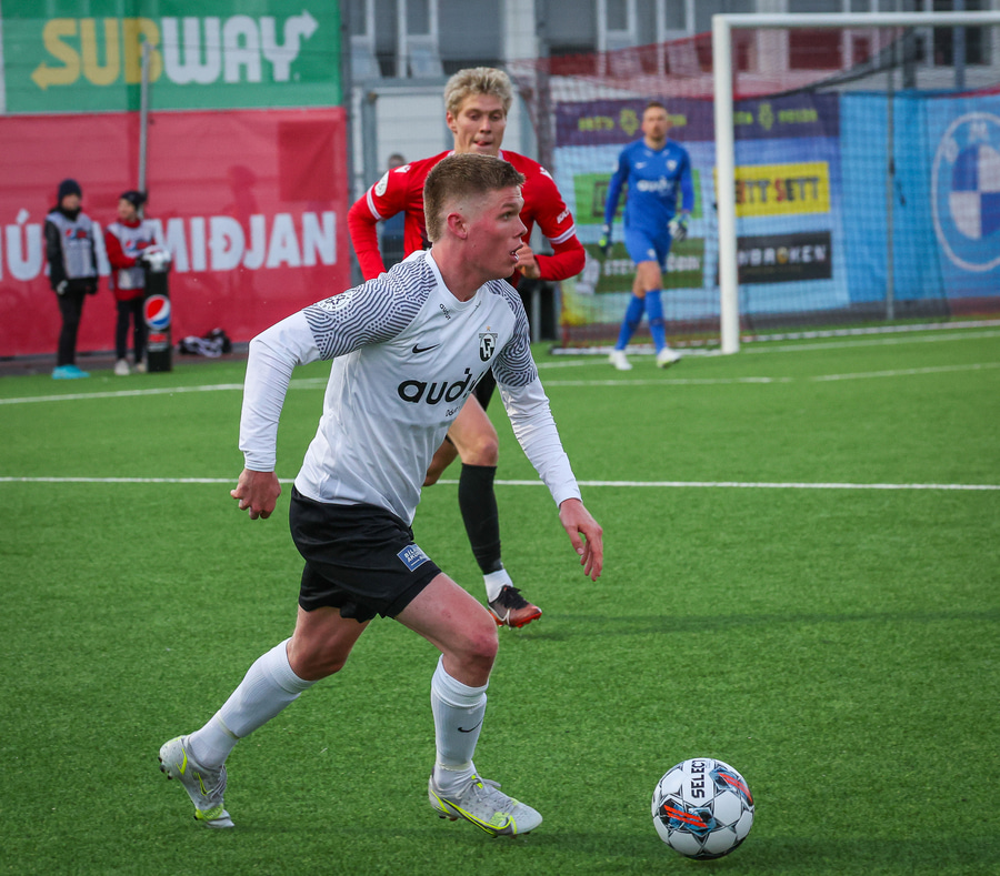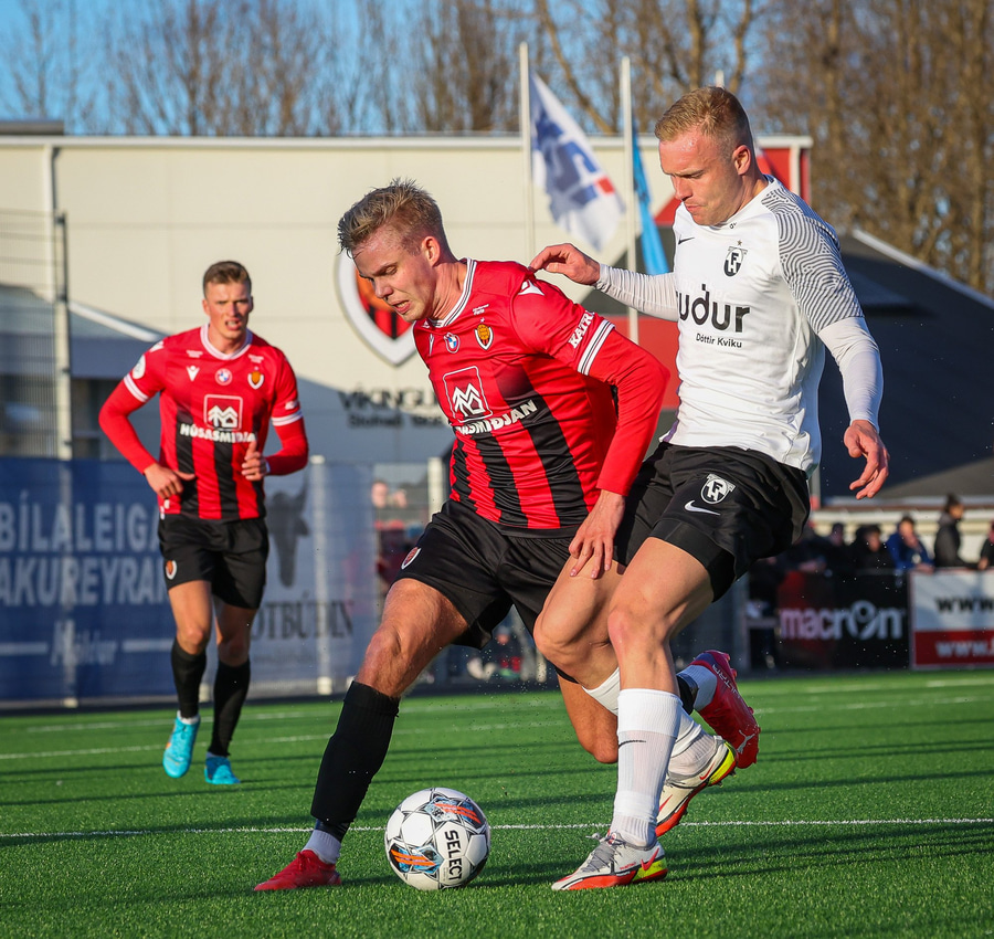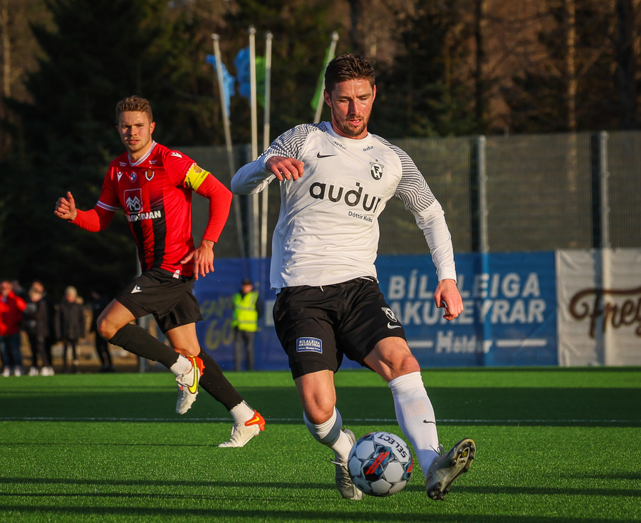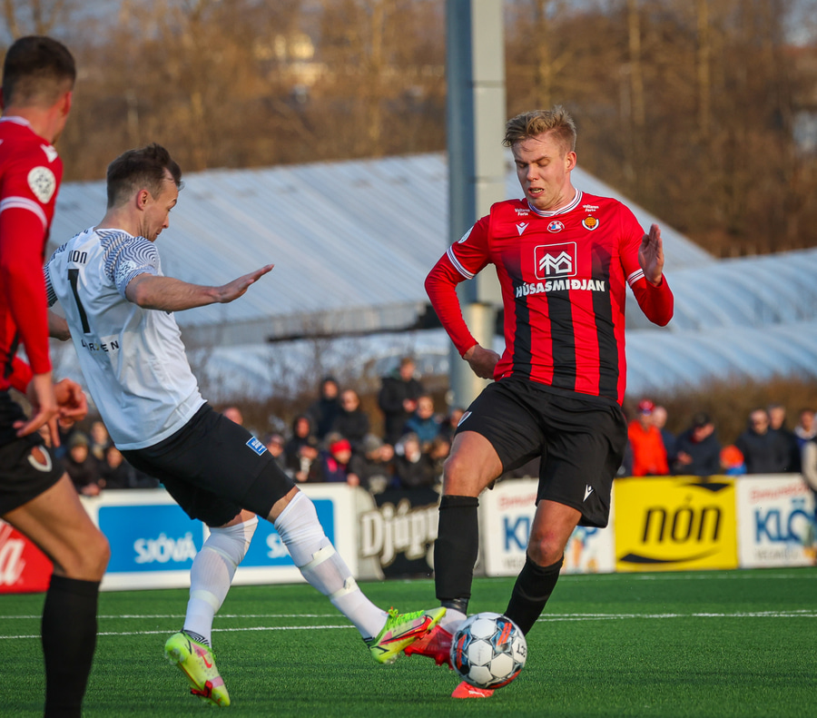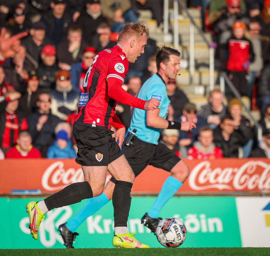 Kristall Máni með aukaspyrnu inn á teiginn eftir að Ari Sigurpáls var felldur af Óla Guðmunds. Þetta endar á skoti frá Viktori Örlygi en framhjá/yfir fór það.