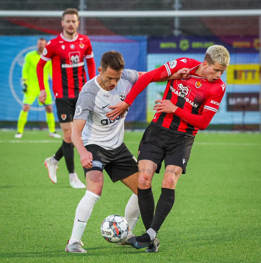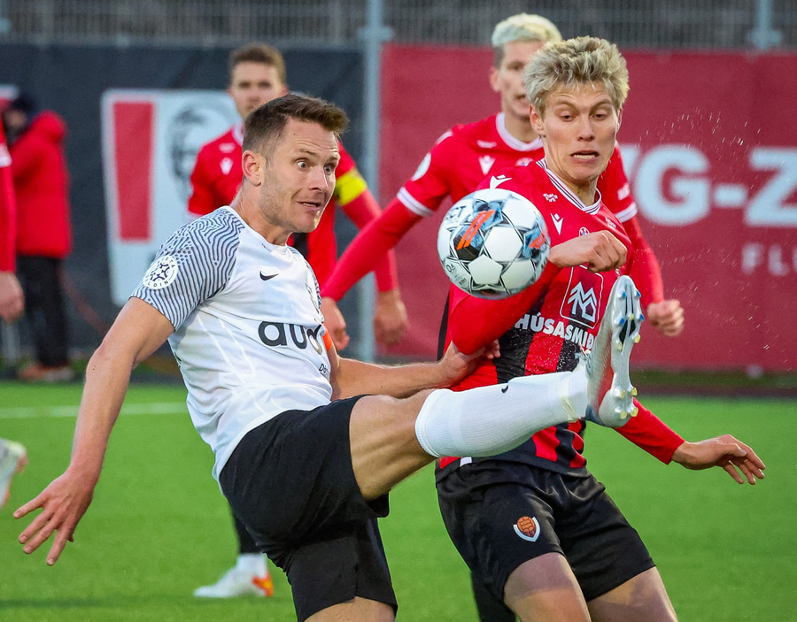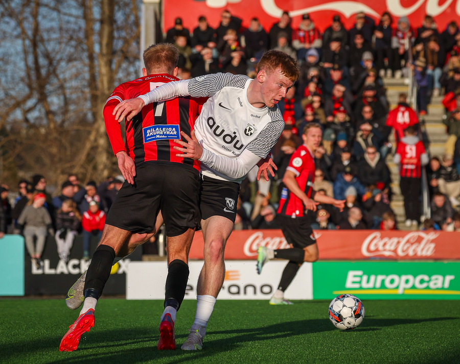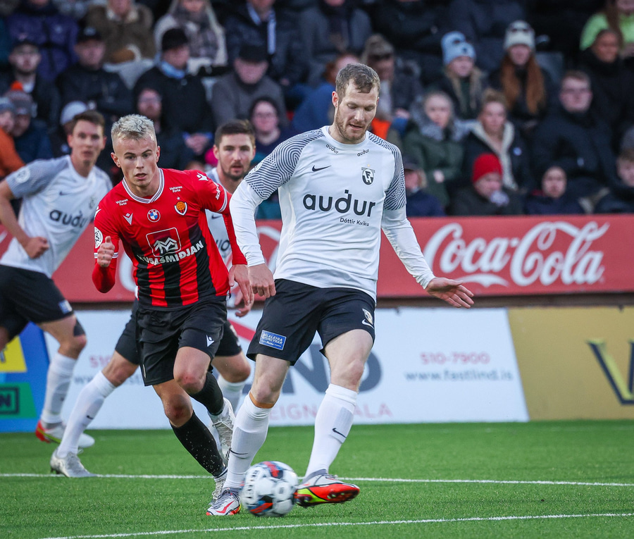 Matthías flikkar boltanum inn á vítateig Víkings, Lennon reynir að elta en er dæmdur rangstæður.