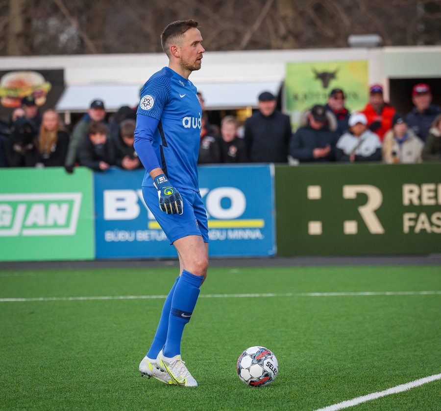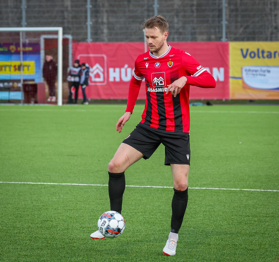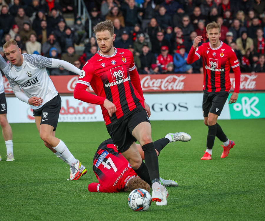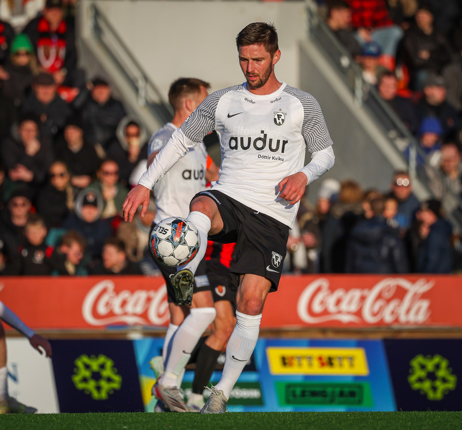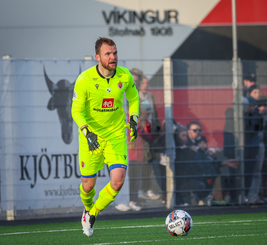 Nikolaj reynir að finna samherja inn á teignum en auðvitað er Guðmundur Kristjánsson gerir virkilega vel. Víkingur á hornspyrnu.