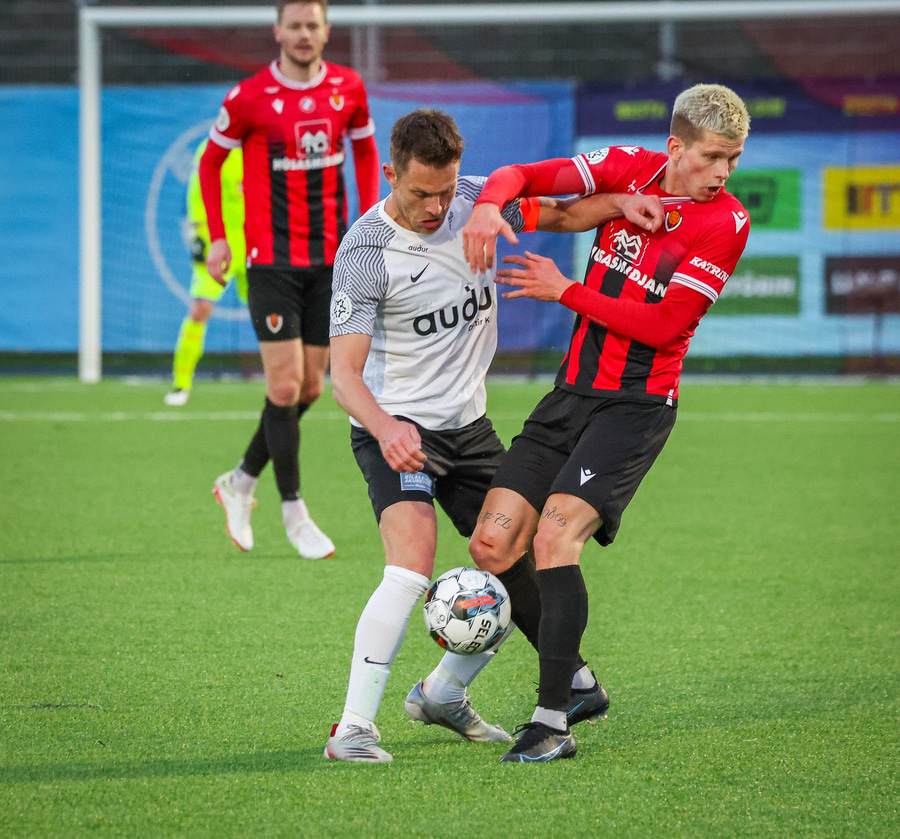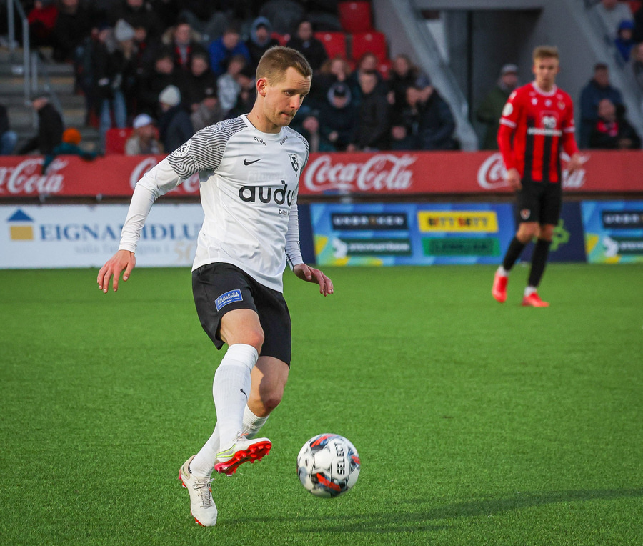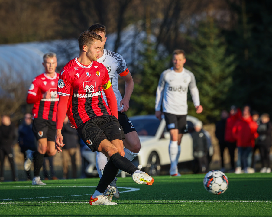 Eggert dæmdur brotlegur eftir þessa spyrnu frá Kristni.