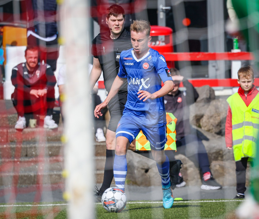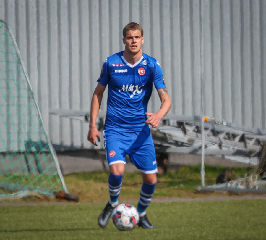 Valgeir brýtur á sér rétt fyrir utan teyg HK. Spurning hvort Kári Kristjáns nái að setja þetta á markið.