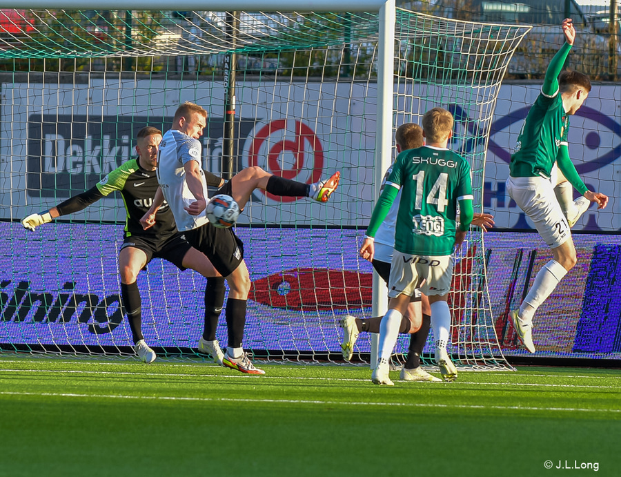 Jason Daði þræddur á bakvið vörn FH og kemst upp að endamörkum og reynir fyrirgjöf ætlaða Ísak Snæ inni í teig en Gunnar Nielsen grípur boltann.