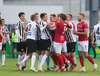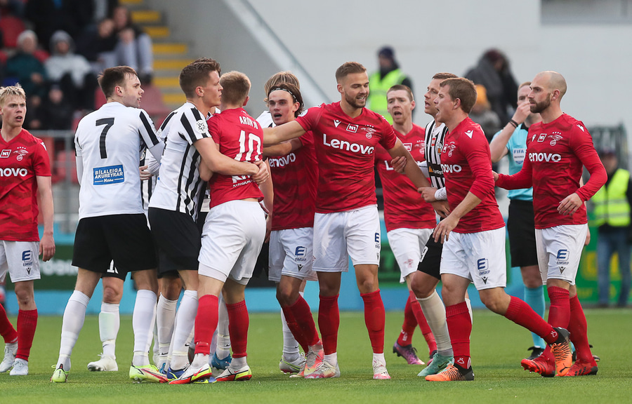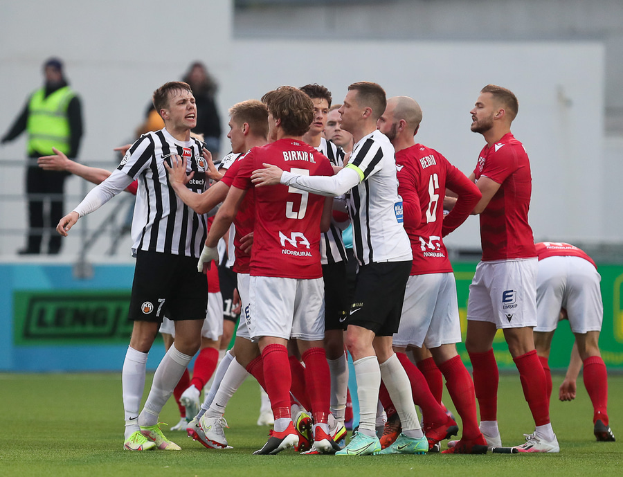 Það fer svo að Haukur Páll lætur finna fyrir sér og fer harkalega með öxlina í Theodór Elmar. Í kjölfarið verður allt vitlaust inná vellinum.