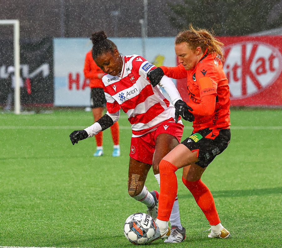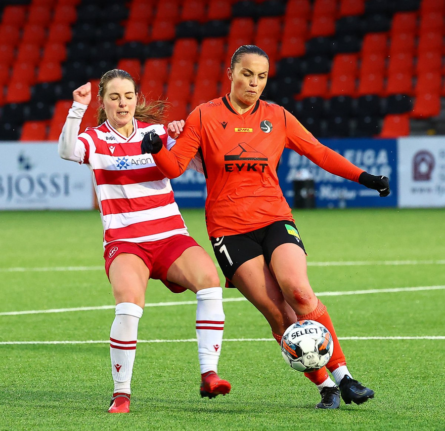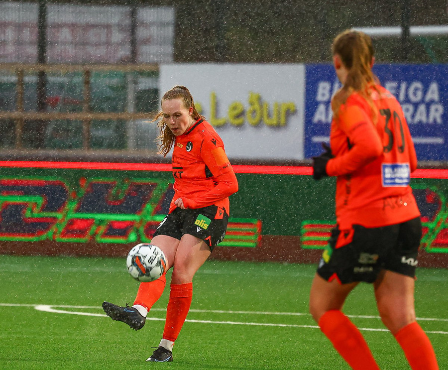 Emily skýlir boltanum, Sóley María brýtur á henni og uppsker gult spjald
