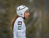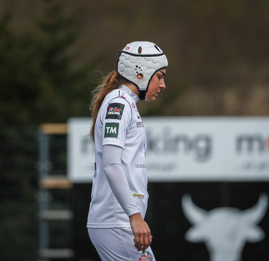 Andrea Mist fékk höfuðhögg í síðasta leik en lætur það ekki stoppa sig og skartar því þessum glæsilega hjálmi í dag.